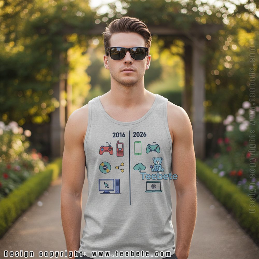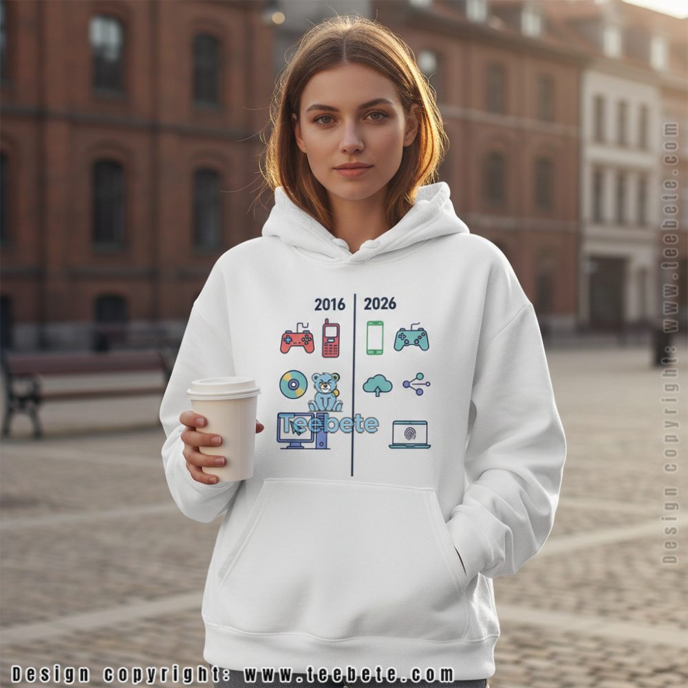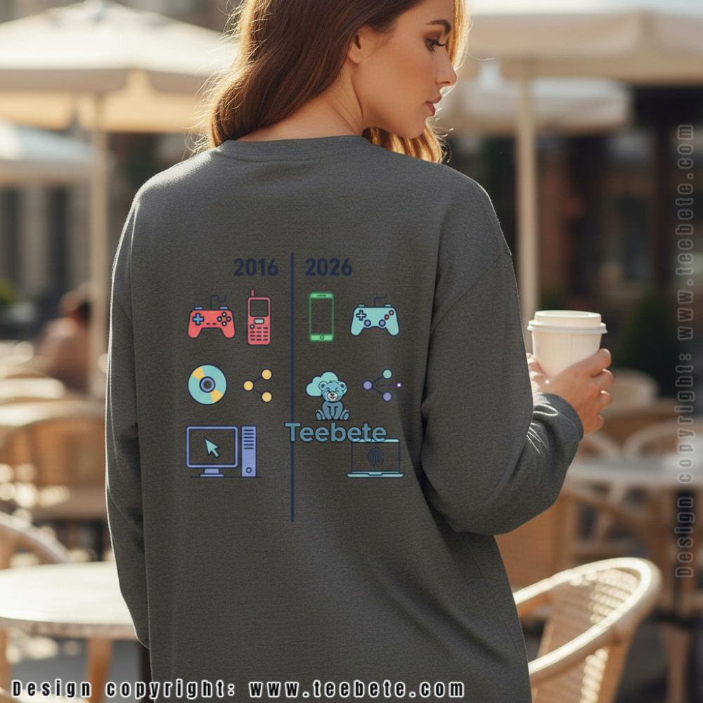 The decade-spanning tech comparison resonates with millennials and Gen Z who lived through this specific transformation period. Perfect for tech enthusiasts appreciating rapid innovation pace, nostalgic wear celebrating simpler times while acknowledging progress, or conversation-starter apparel at gatherings where generational differences spark discussion, this design captures a transformative decade. The side-by-side format offers wearers a visual timeline of how dramatically technology evolved in just ten years—from physical media to cloud storage, from Nokia bricks to smartphones, from desktop cursors to biometric security—creating wearable commentary on the acceleration of technological change that defined the 2010s and 2020s.