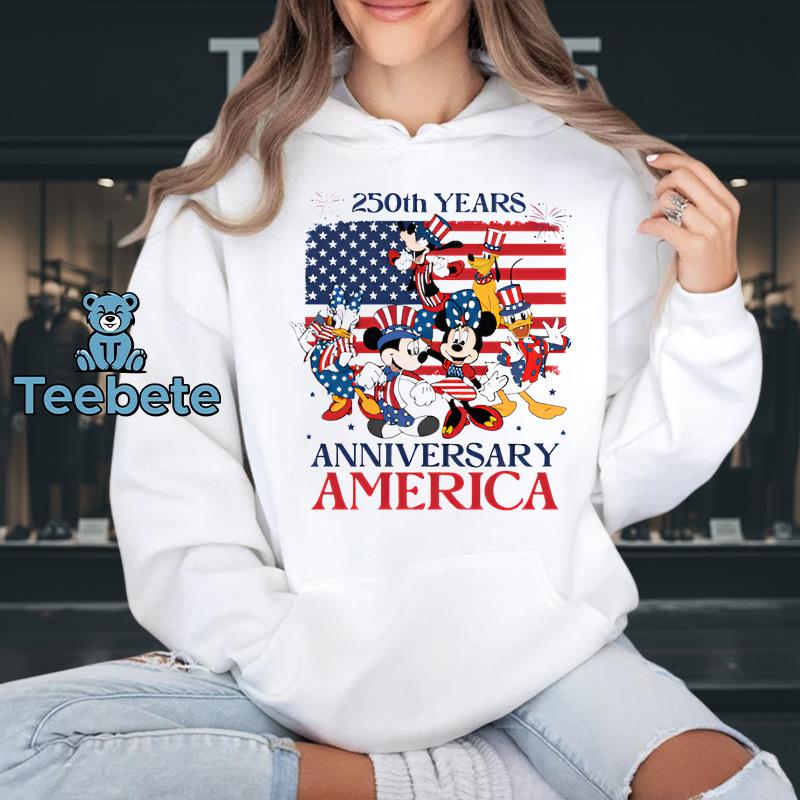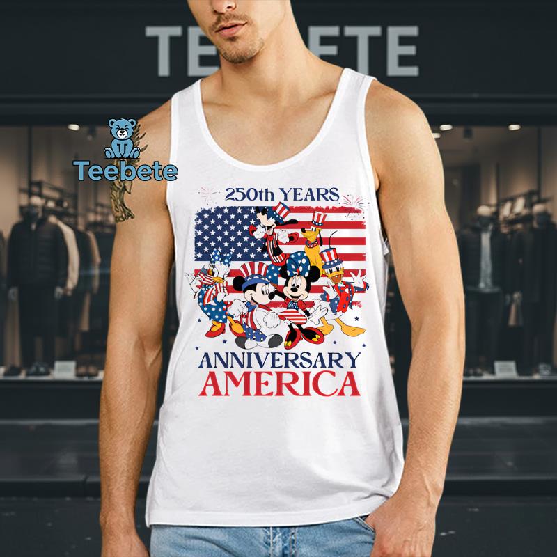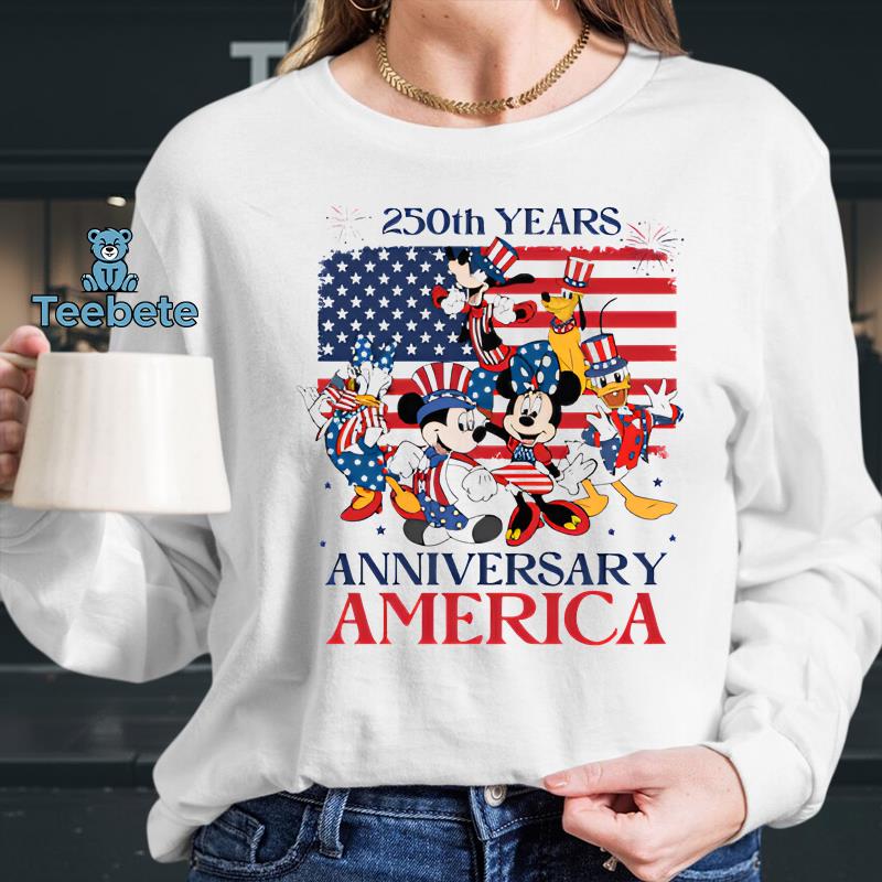 Festive graphics take center stage on this T-Shirt, where classic American cartoon charm meets the vibrancy of Independence Day celebrations. The America 250th Anniversary Mouse And Friends Independence Day T-Shirt features a lively composition that showcases beloved characters arrayed in a playful, patriotic tableau. The design bursts with red, white, and blue, harmoniously emphasizing the festive spirit of the holiday. Rich illustrations of iconic figures are intricately printed across the fabric, creating a full-coverage visual delight that beckons fans of all ages.