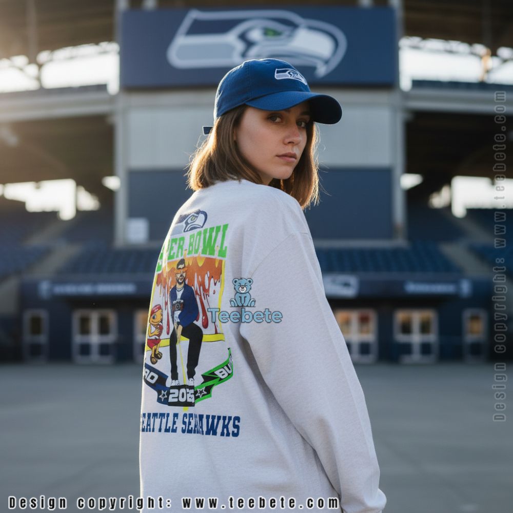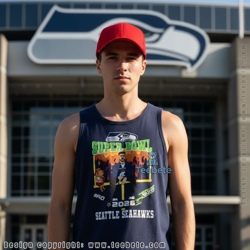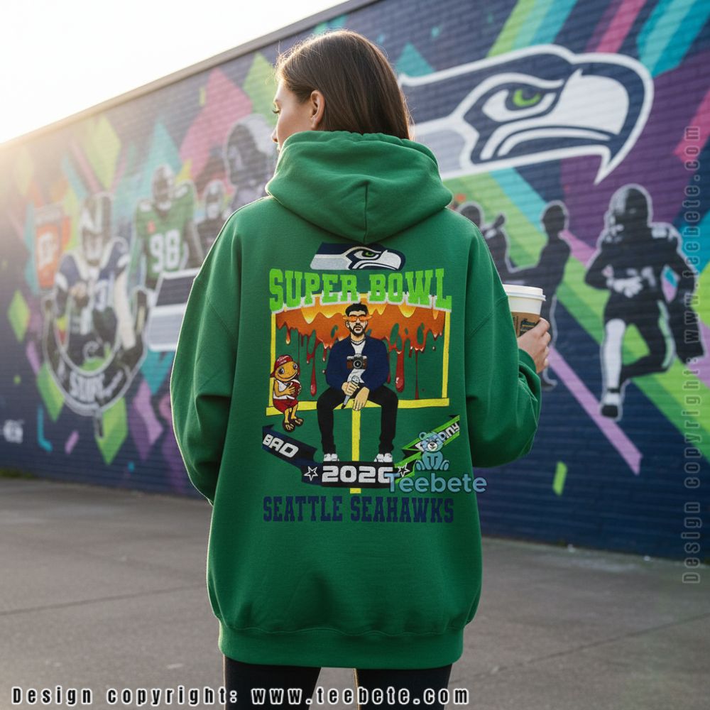 This crossover design merges music culture with football fandom in an unexpected way. The front features “SUPER BOWL” text alongside Bad Bunny character graphics and “BRO SINCE 2026 SEATTLE SEAHAWKS” branding, creating a unique mashup that celebrates both pop culture and team loyalty. It’s perfect for fans who want their game day apparel to reflect multiple aspects of their identity.