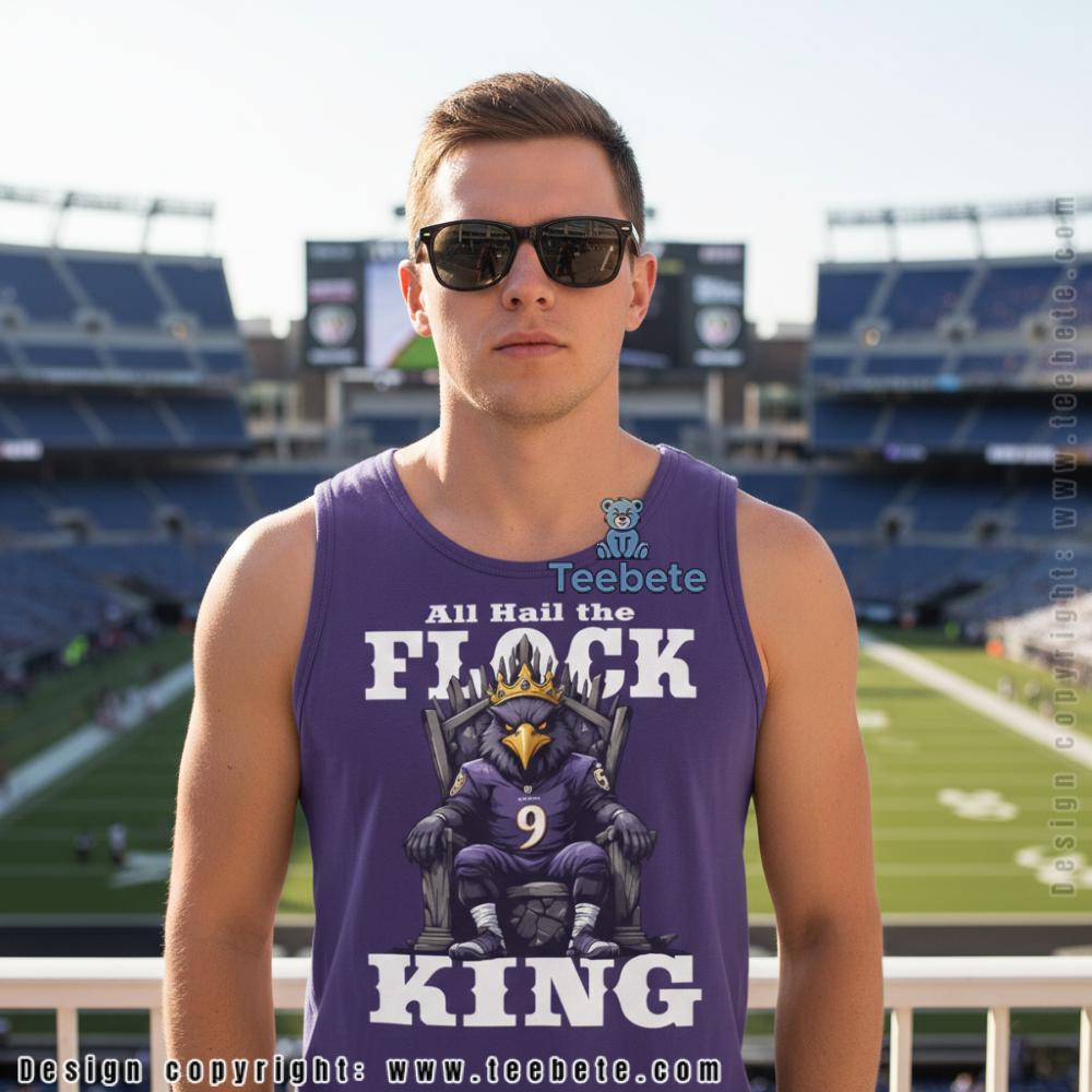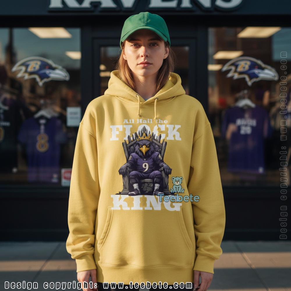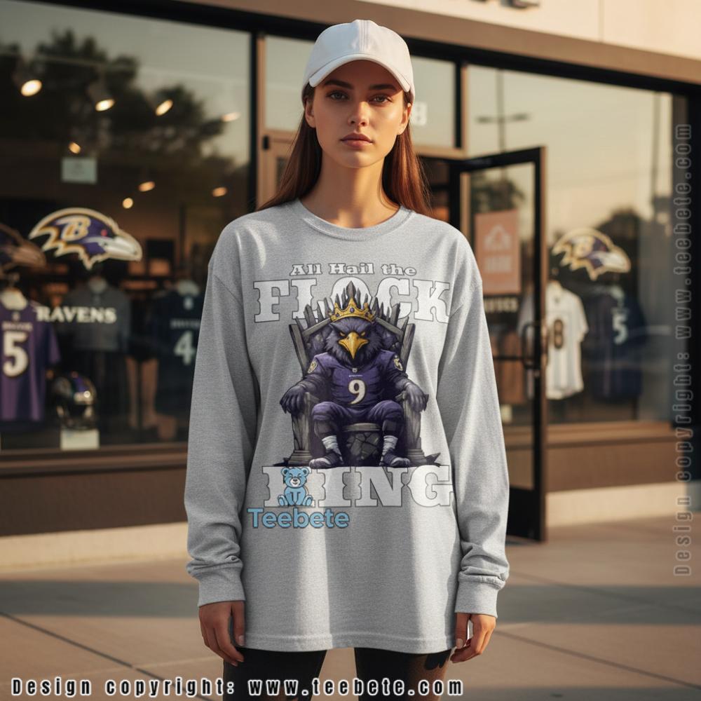 Royal imagery elevates team mascot to throne on this bold statement shirt, where a regal raven sits commandingly in an ornate stone chair wearing a golden crown and purple jersey with number 9. “All Hail the FLOCK” appears in distressed white lettering above the majestic bird, while “KING” anchors the bottom in equally prominent weathered typography. The Baltimore Ravens All Hail The Flock King Shirt features the crowned raven rendered in detailed illustration with fierce eyes, sharp beak, and battle-worn armor plating visible beneath the purple uniform. Medieval throne elements including carved stone details and armrests frame the commanding figure, while the vintage black fabric adds gritty texture to the regal composition. The distressed text treatment throughout creates aged, battle-tested aesthetic that matches the warrior-king imagery. Classic crew neck construction with centered graphic placement delivers the coronation declaration through straightforward design that positions the mascot as sovereign ruler.