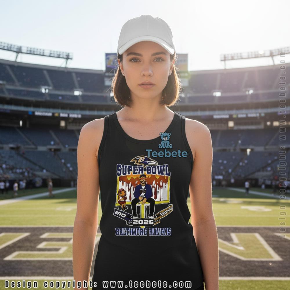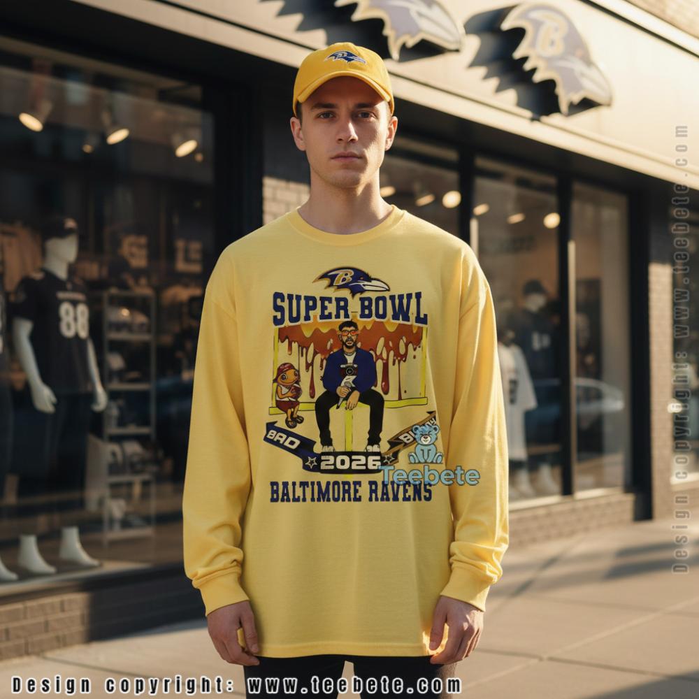 Championship anticipation meets entertainment spectacle on this commemorative shirt, where the Ravens logo hovers above “SUPER BOWL” in bold white lettering with purple outline. Below, an illustrated figure in dark suit sits confidently on a throne-like golden chair, flanked by cartoon mascot characters including an orange mascot to the left and team imagery to the right. Dripping gold paint effects create luxurious backdrop behind the seated performer, while “BAD BUNNY” and “SLIME” appear on curved banners at the figure’s feet. “2026” displays prominently in white with star accents, and “BALTIMORE RAVENS” anchors the bottom in bold purple lettering. The Baltimore Ravens Bad Bunny Super Bowl 2026 Concert Tee features this elaborate composition centered on rich purple fabric, combining sports championship imagery with concert announcement aesthetics through detailed illustration work and multiple text elements in team colors.