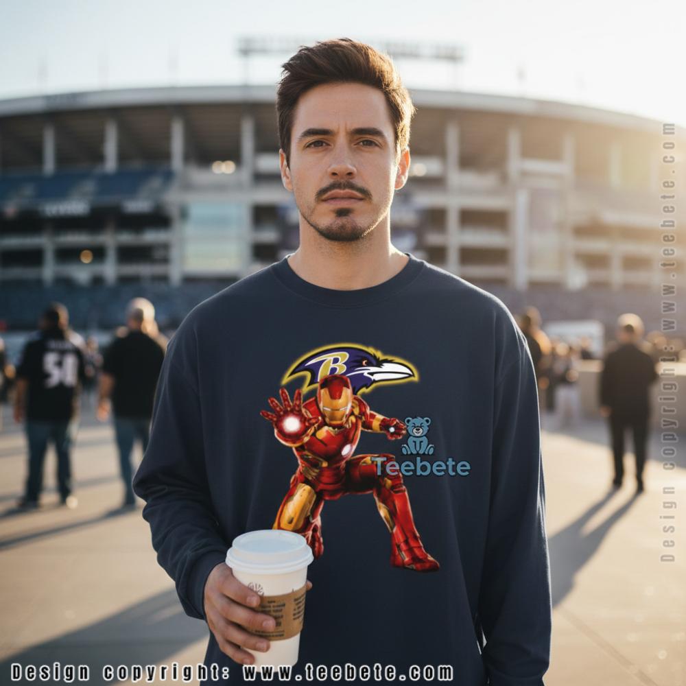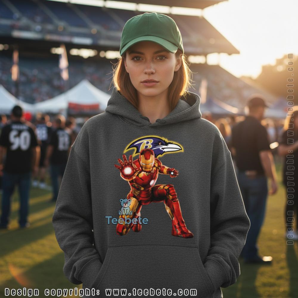 Fans looking for bold crossover style will appreciate this tee designed for Baltimore Ravens supporters, featuring a superhero character in iconic red and gold armor posed dynamically beneath the Ravens logo. Shown in sport grey, this shirt is also available in multiple colors including black, navy, and white. The graphic merges comic book action with team pride, creating a unique look for fans who want their gear to reflect both their football loyalty and pop culture interests.