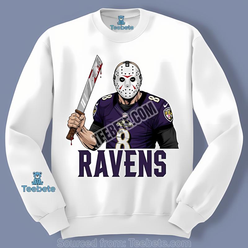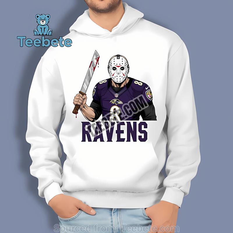 Elevate your wardrobe with this eye-catching design and embrace the intersection of sports and horror. Join the ranks of passionate fans who aren’t afraid to show their love for the Ravens and their spooky side. Order your Baltimore Ravens Jason Voorhees Machete Horror Football Shirt today and make a bold statement!