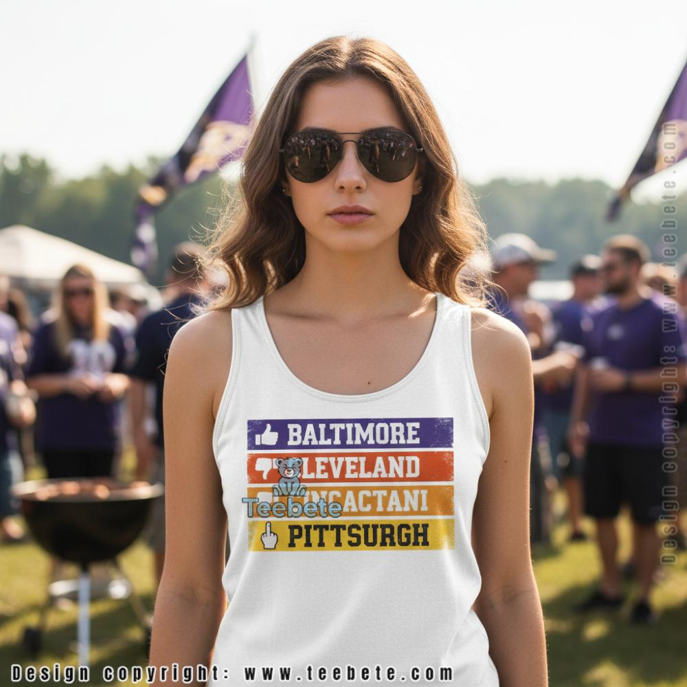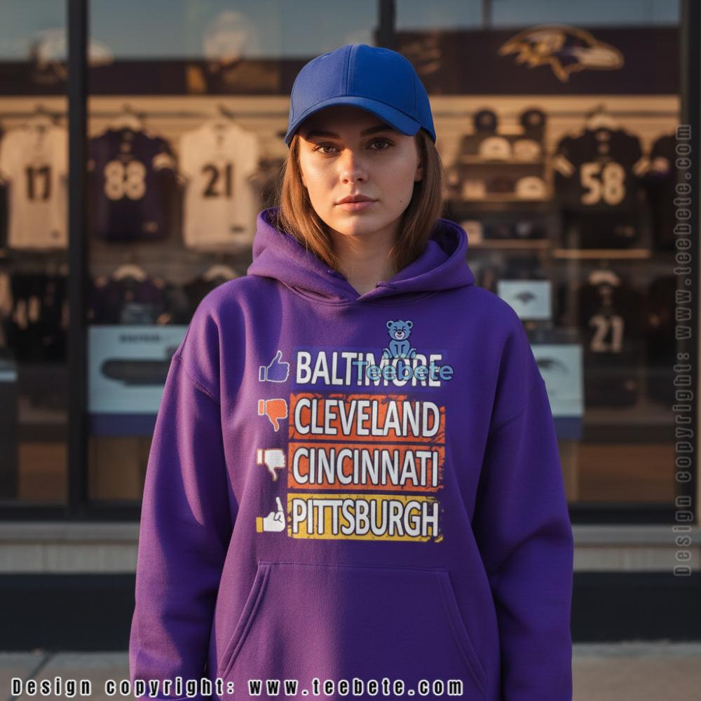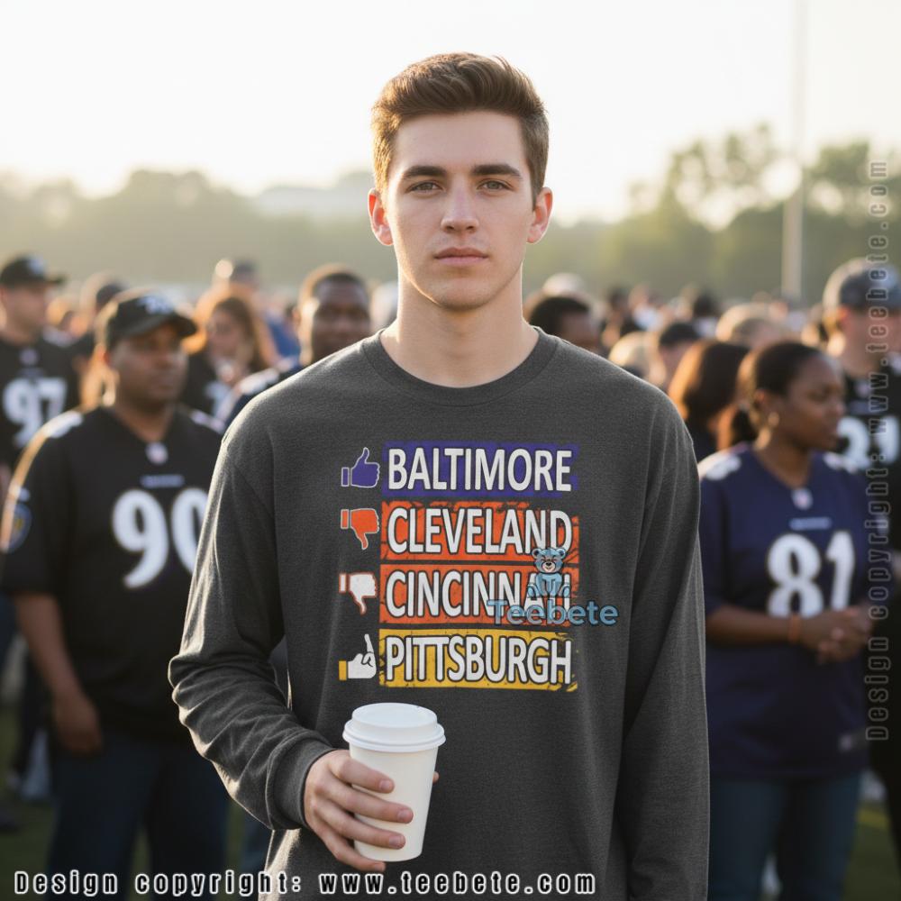 A fan-made design for Baltimore Ravens supporters, this tee ranks AFC North teams with thumbs up and down icons: Baltimore receives approval while Cleveland, Cincinnati, and Pittsburgh get disapproval in orange and gold text. Shown in navy, this shirt is also available in multiple colors including black, purple, and sport grey. The straightforward hierarchy makes the wearer’s allegiance and opinions crystal clear with humor that needs no explanation among division rivals.