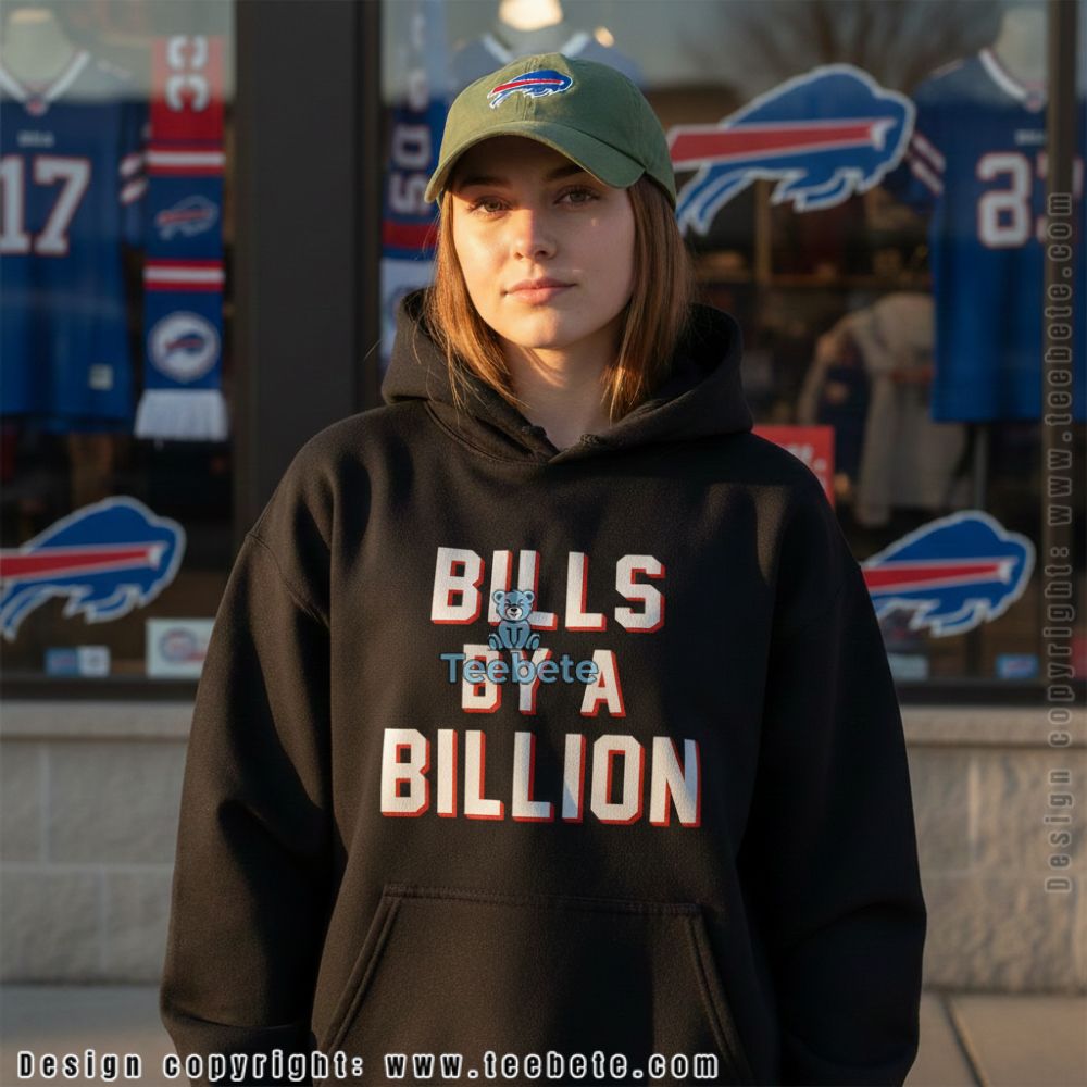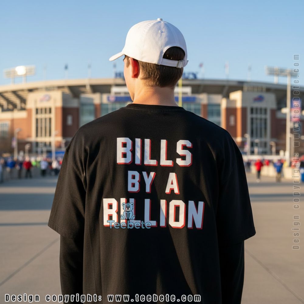 The Bills By A Billion Funny Football Shirt is a vibrant T-shirt that showcases a playful blend of humor and sports fervor. The design features bold, eye-catching graphics that integrate fun football-related motifs alongside witty text elements. Set against a striking background of rich colors, the shirt utilizes a full-coverage printing style that ensures crisp imagery from seam to seam, making every detail pop. The arrangement of visuals invites a closer look, presenting an engaging spectacle perfect for game day or casual outings.