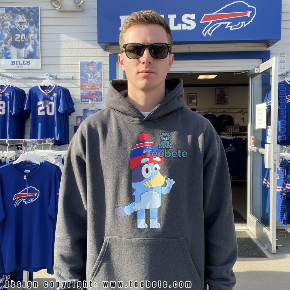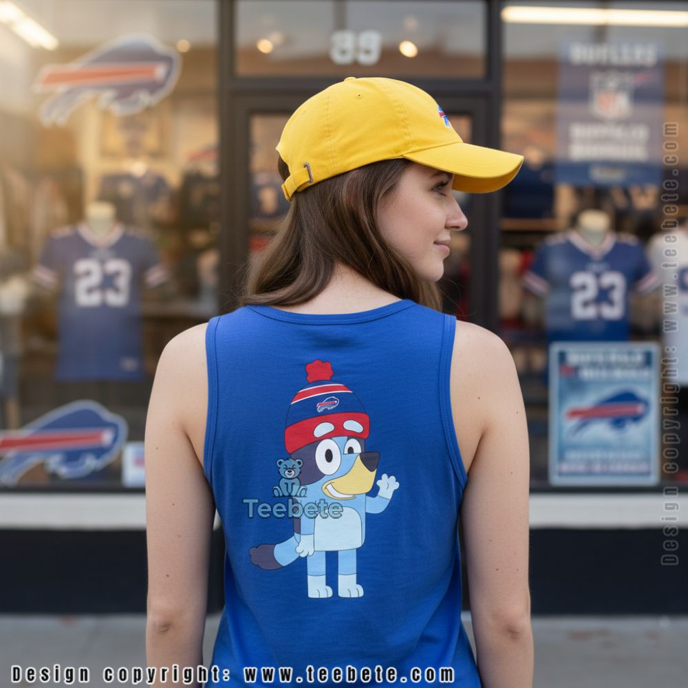 Showcasing vibrant graphics, the Bluey Buffalo Football Fan Mascot Kids Shirt is a dynamic addition to any young fan’s wardrobe. Crafted as a playful T-shirt, the design features an eye-catching mascot illustration, seamlessly positioned against a bold, colorful background. The imagery bursts with energetic hues, enhancing the spirited theme while incorporating layered elements that create depth. With full-coverage printing, each detail pops, making it an unforgettable piece for game day or casual wear.