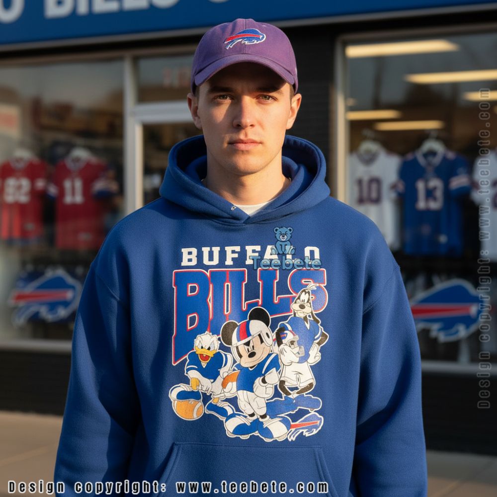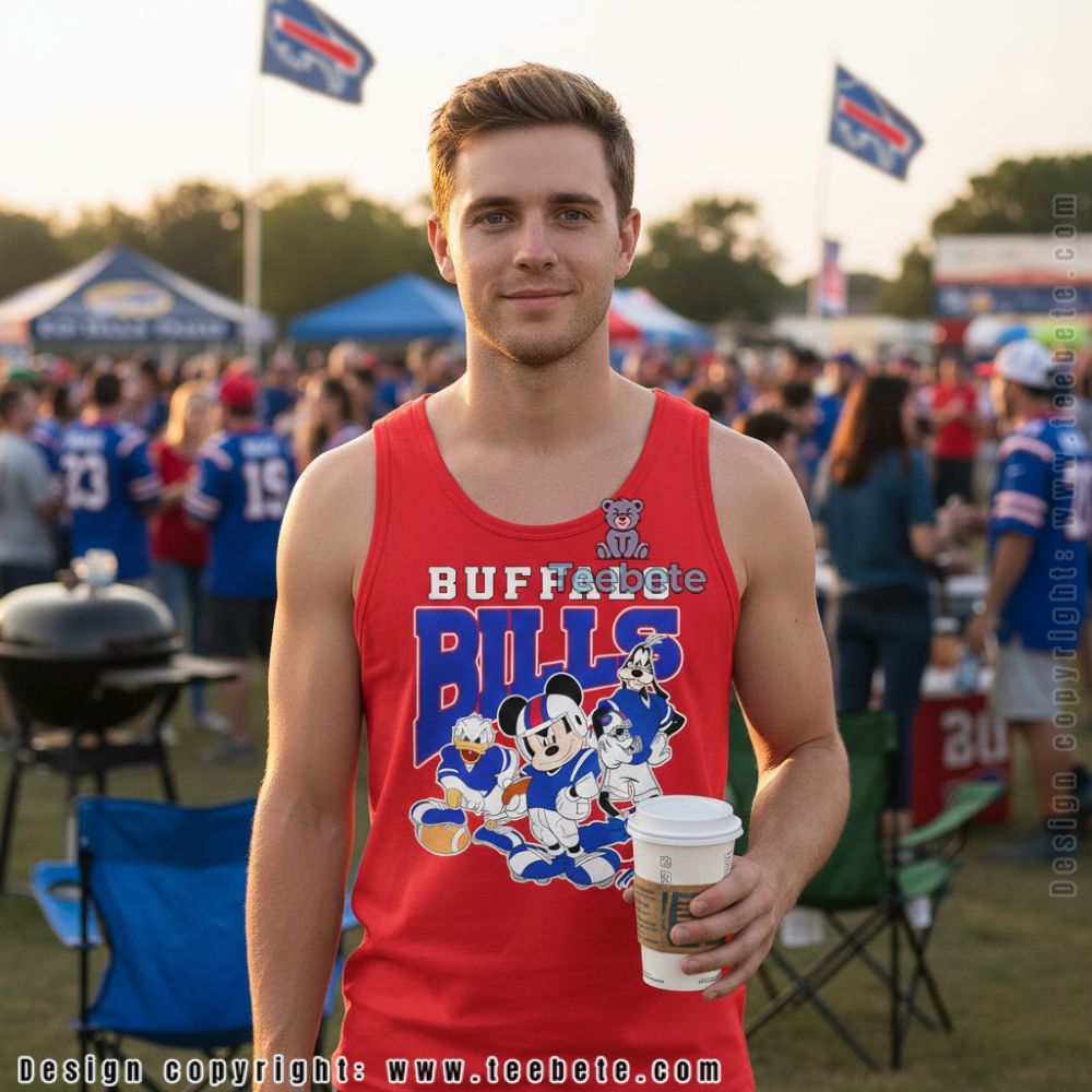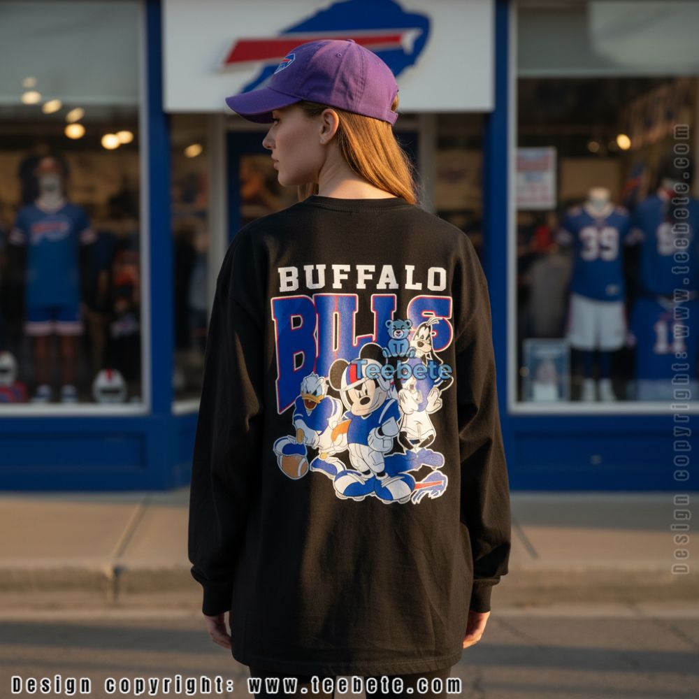 Crafted as a vibrant T-Shirt, the Buffalo Bills Disney Team Cheering Shirt boasts an eye-catching visual design that expertly marries sports enthusiasm with playful elements. Bold graphics of the Buffalo Bills mascot feature prominently, complemented by whimsical Disney-themed accents that enhance the overall look. The design utilizes a lively color palette of royal blue and bright red, creating a striking contrast that captures attention. With full-surface printing techniques, the imagery wraps around seamlessly, ensuring that every angle radiates team spirit and joy.