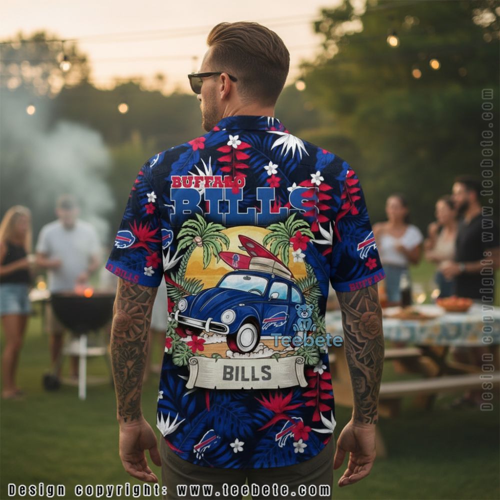 Vibrant tropical motifs adorn the Buffalo Bills Hibiscus Floral Surf Beetle Car Vacation Shirt, a standout Hawaiian shirt perfect for sunny escapades. Featuring a vivid arrangement of hibiscus flowers and playful beetles, the design boasts a harmonious layout created through full-coverage printing that envelops the entire shirt. The graphic burst of color includes rich greens and radiant pinks, complemented by deep blues, ensuring a striking contrast that captivates the eye. The intricate details add depth and intrigue, making it a must-have for summer adventures or beach outings.