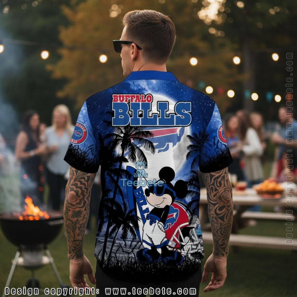 Reflecting a unique fusion of sports and iconic Disney imagery, this design gives off a whimsical yet bold vibe, perfect for casual get-togethers or summer beach outings. The nocturnal theme presents an alluring mood, ideal for evening events or nighttime adventures. Emphasizing the playful spirit of both the Buffalo Bills and Mickey Mouse, this shirt stands out in any crowd, making it a must-have for fans and fashion enthusiasts alike.