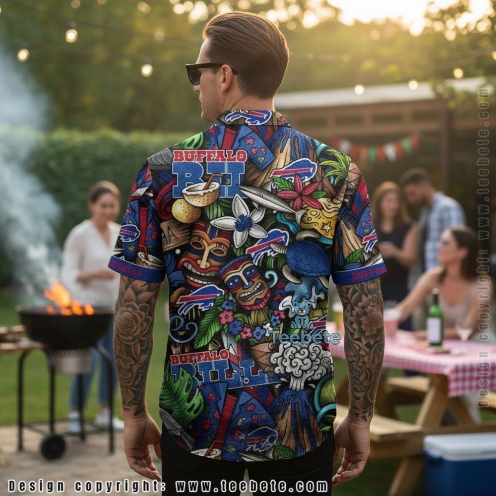 Distinctively characterized by its lively motif, the Buffalo Bills Tiki Mask Hawaiian Shirt is a standout apparel piece perfect for warm weather occasions. Featuring a full-surface 3D printing technique, the shirt showcases an intricate layout of tiki mask graphics interspersed with bold tropical elements, creating a lively and eye-catching visual. The vibrant color palette incorporates rich blues, vibrant reds, and sunny yellows, providing a striking contrast that draws attention and enhances the festive feel.