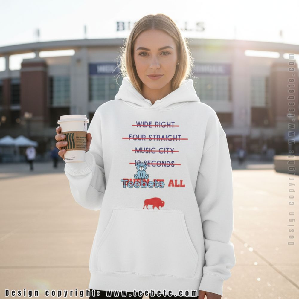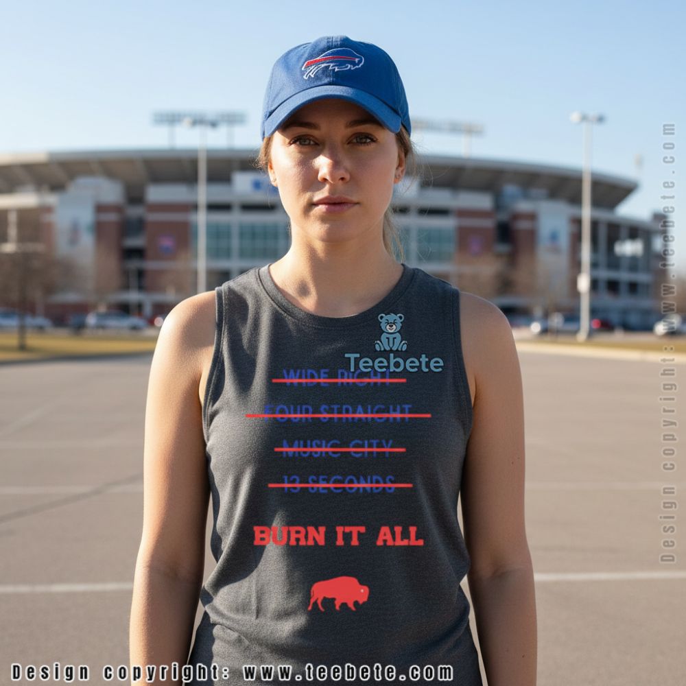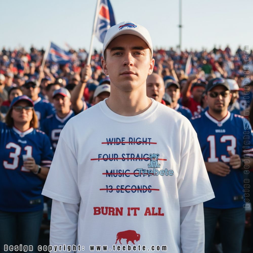 Artfully designed, the Buffalo Wide Right Four Straight Music City 13 Seconds Burn It All Shirt is an eye-catching staple that brings together a vibrant array of colors and graphics. This T-shirt showcases a striking layout that combines bold typography with dynamic imagery, creating an energetic focal point. The balanced color palette enhances its visual appeal, using contrasting shades to emphasize key elements. Full-coverage printing adds depth to the graphics, ensuring they stand out in any setting.