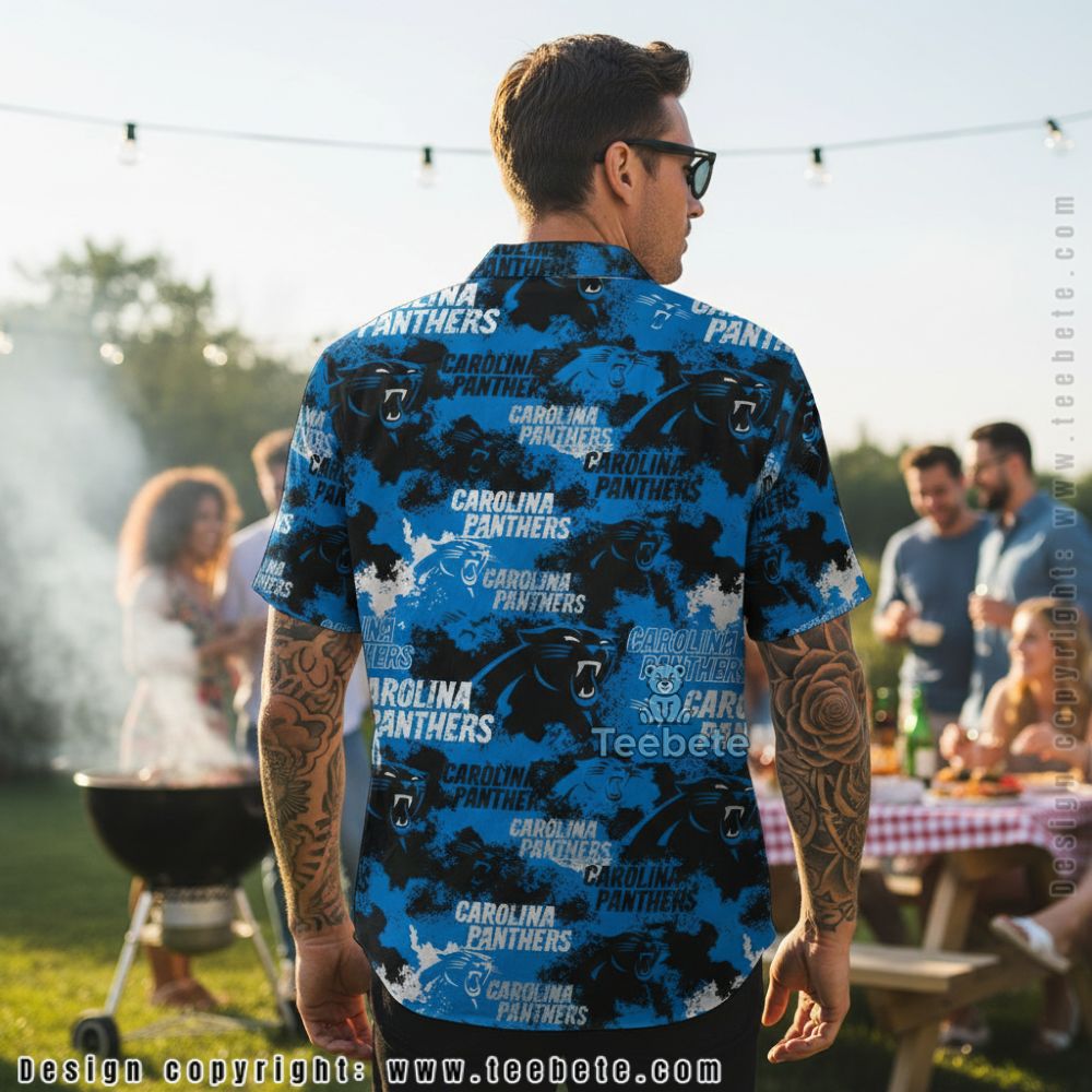 The aggressive camo-text combination appeals to fans seeking bold, statement-making apparel with urban edge. This blue camo button-up delivers intense styling suitable for game-day events, tailgates, or casual gatherings where comprehensive team branding makes unmistakable declarations of loyalty, offering supporters maximalist design that celebrates Panthers pride through relentless graphic repetition and contemporary tactical aesthetics.