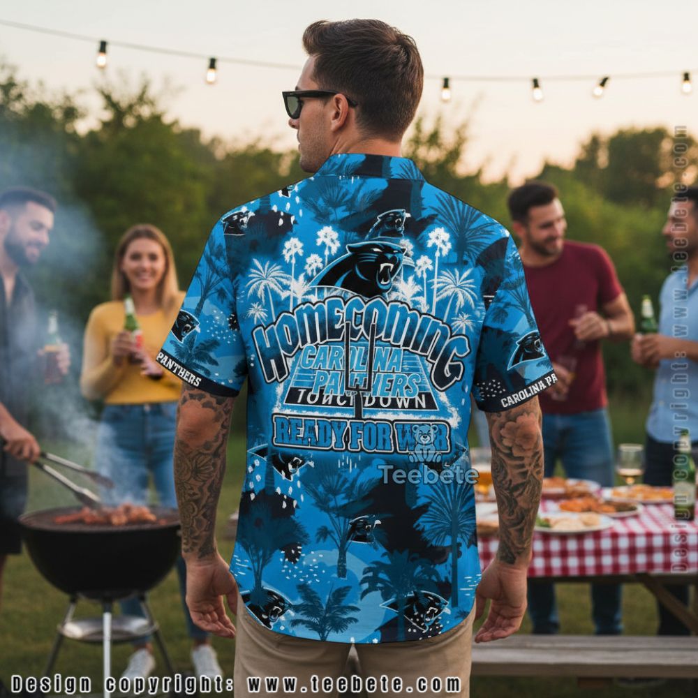 Tropical hibiscus blooms and palm fronds create lush botanical backgrounds on the Carolina Panthers Homecoming Ready For War Tropical Palm Hawaiian Shirt, rendered in vibrant blue tones. Panthers logos scatter throughout the floral pattern like hidden elements within the island foliage, while “CAROLINA PANTHERS” text dominates the center in bold italicized lettering with dimensional shading. The oversized roaring mascot logo anchors the chest prominently against the tropical backdrop. Hibiscus flowers in various scales add depth to the composition, mixing with palm leaf patterns in lighter and darker blue variations. “CAROLINA PANTHERS” sleeve bands wrap around the arms in white text on blue backgrounds. The all-over tropical pattern balances traditional Hawaiian aesthetics with comprehensive team branding. This Hawaiian shirt employs dense sublimation printing on a camp collar design, where authentic island botanicals integrate with aggressive team messaging and logo repetition.