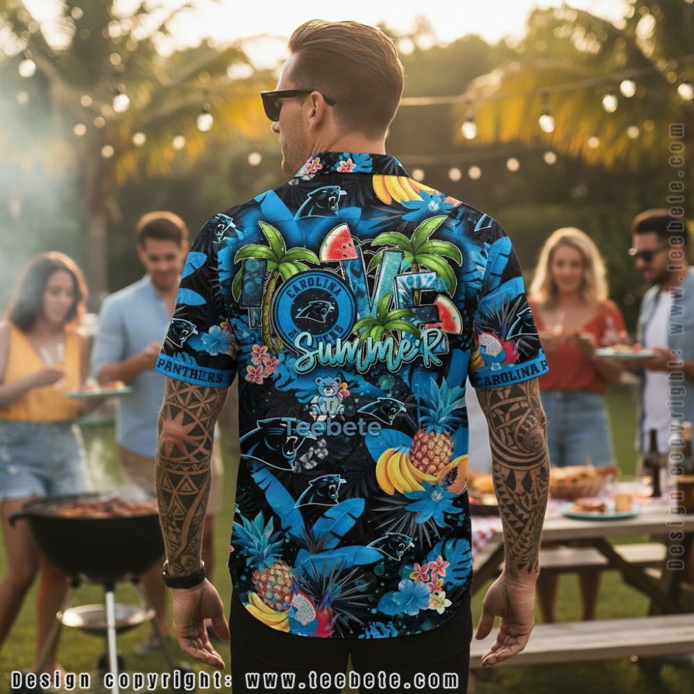 The Carolina Panthers NFL Pineapple Hibiscus Floral Beach Shirt brings tropical flair to football fandom through vibrant Hawaiian-inspired design elements. This short-sleeve button-up showcases the team’s iconic panther logo positioned prominently across the chest, integrated seamlessly into a full-coverage tropical print. Bright blue hibiscus flowers, golden pineapples, and lush palm fronds create a layered pattern against a dark base, while “CAROLINA PANTHERS” text appears in bold lettering. The team’s signature black and electric blue colors dominate the composition, with splashes of pink, yellow, and turquoise adding dimension. Each design element maintains sharp contrast, with the panther emblem serving as the central focal point amid the scattered botanical motifs.