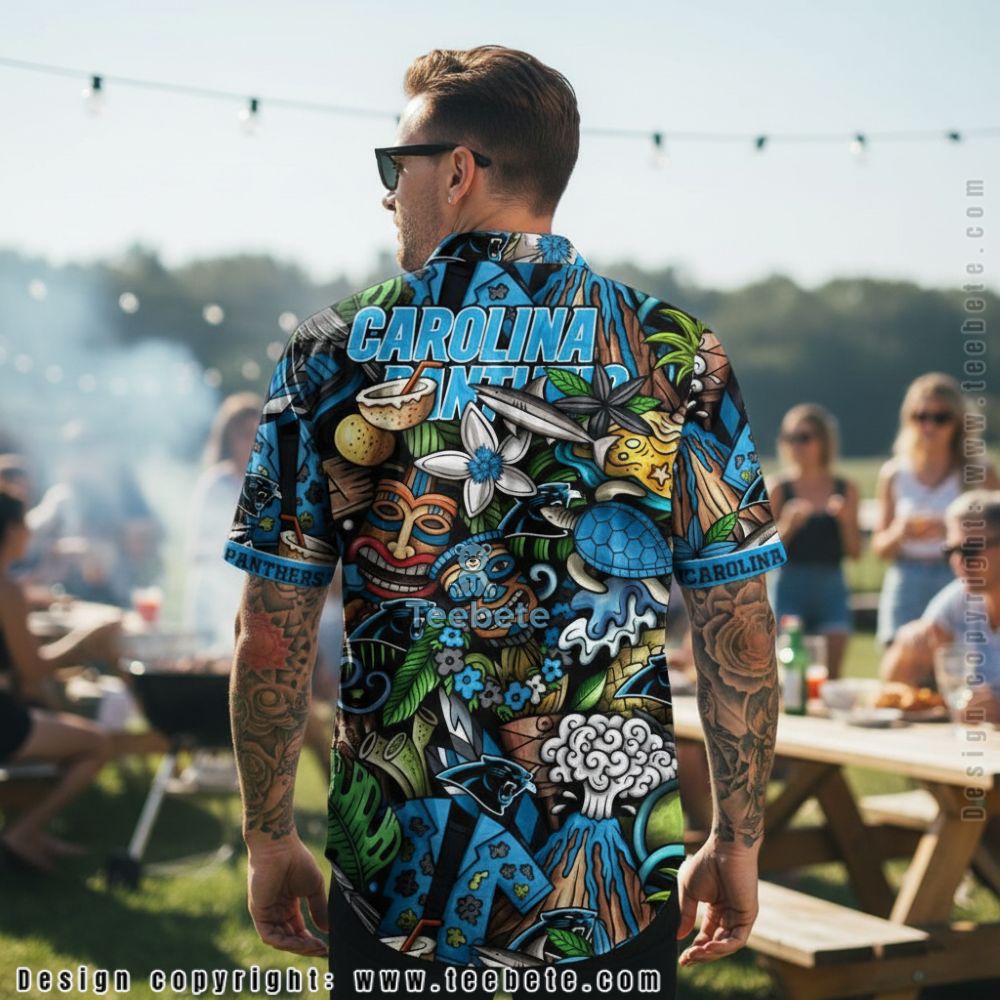 Playful tiki-inspired illustrations pack every inch of this vibrant summer shirt. Carved tiki masks grin widely across the Carolina Panthers Tiki Culture Doodle Art Summer Hawaiian Shirt, surrounded by coconut drinks with striped straws, tropical foliage in lime green and deep emerald, and scattered plumeria blooms in white and blue. The team’s panther logo integrates seamlessly among hand-drawn style elements including monstera leaves, banana bunches, wooden tiki statues, and decorative tribal patterns. A bright blue collar frames the neckline while “PANTHERS” and “CAROLINA” text bands wrap around both sleeves in uppercase lettering. The color scheme balances electric blue, vivid greens, golden yellows, and black backgrounds, with each illustrated component outlined for comic-book clarity. Whimsical details like geometric honeycomb patterns and curling vines fill negative space throughout the Carolina Panthers Tiki Culture Doodle Art Summer Hawaiian Shirt, creating dense, energetic coverage that channels retro Polynesian bar aesthetics.