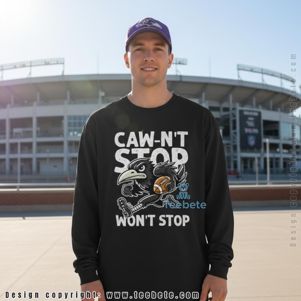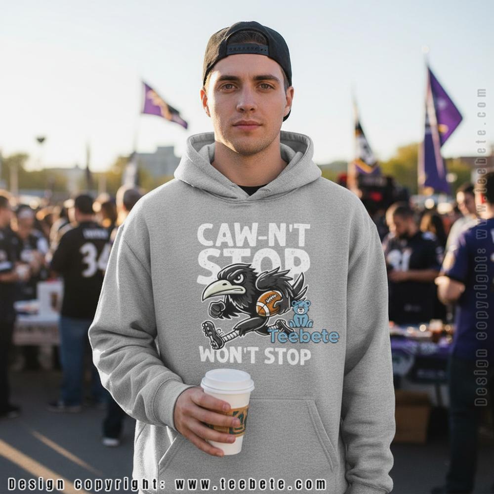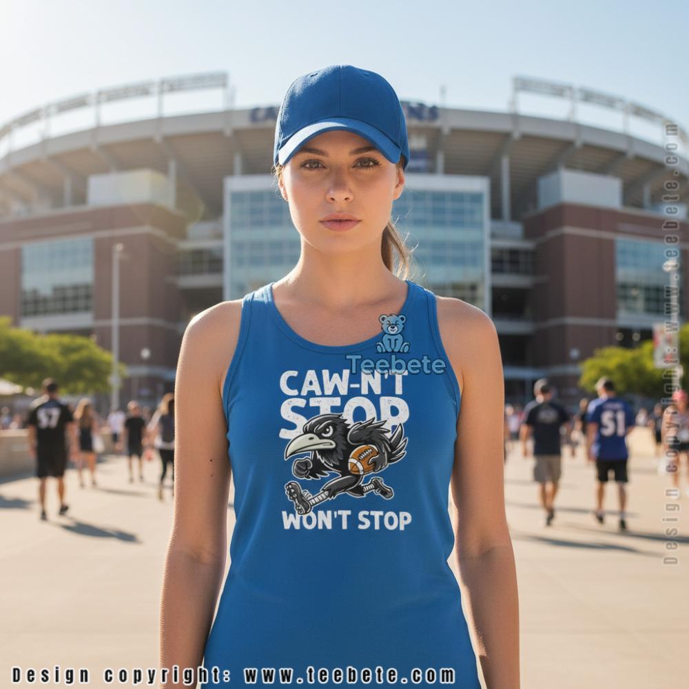Fans looking for clever wordplay will appreciate this tee designed for Baltimore Ravens supporters, featuring “CAW-N’T STOP WON’T STOP” text surrounding an aggressive raven character clutching a football. Shown in purple, this shirt is also available in multiple colors including black, navy, and sport grey. The punny phrase combines the raven’s signature call with a confidence anthem, creating humor that only works for this specific team and fanbase.