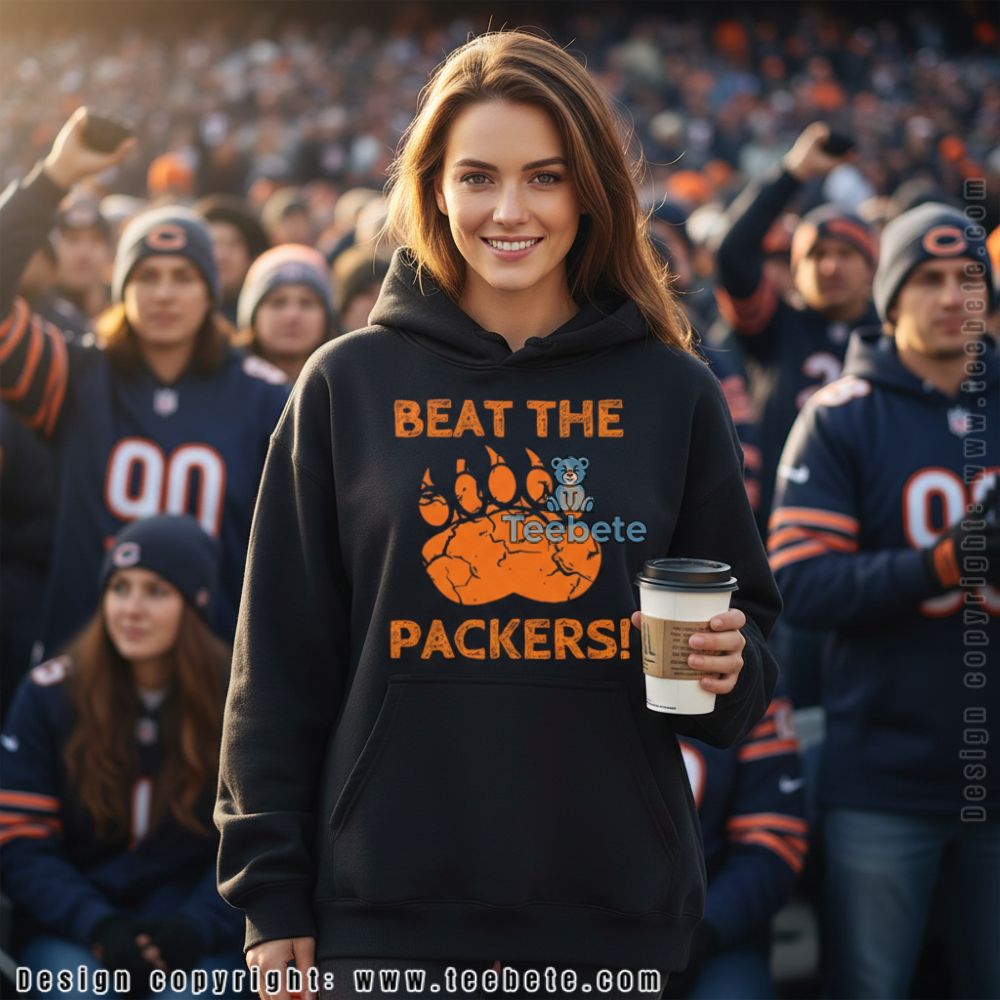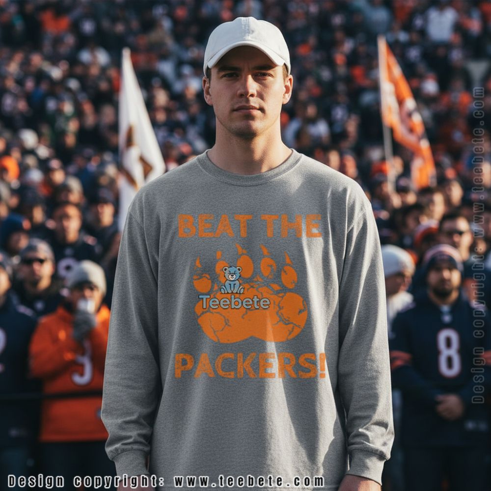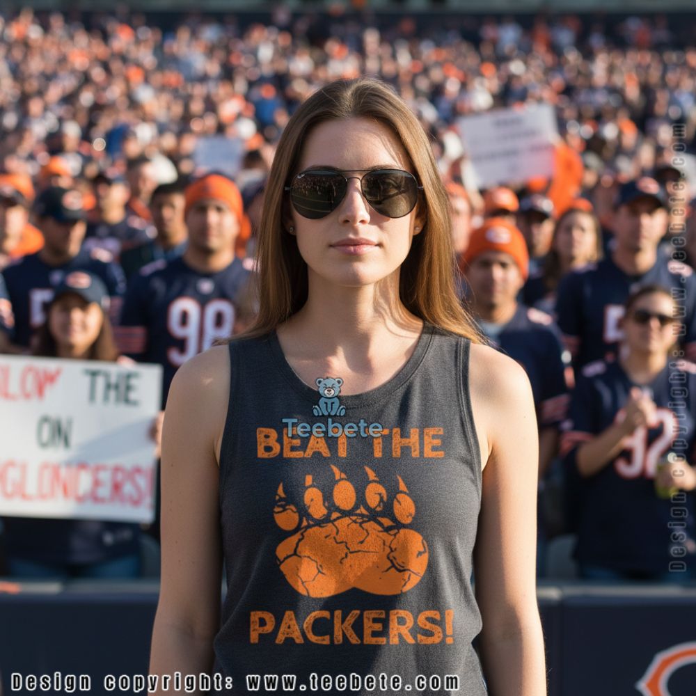 The Chicago Bears Beat The Packers Shirt showcases a dynamic visual arrangement that captures the spirit of rival football teams. It is designed as a classic T-shirt, presenting a striking combination of bold graphics and typography. The shirt boasts a compelling layout where the prominent team logos are positioned against a backdrop in the traditional navy and orange colors, layered with elements that evoke the excitement of game day. With a full-coverage print style, the design integrates spirited text that celebrates the rivalry, ensuring an eye-catching presentation.