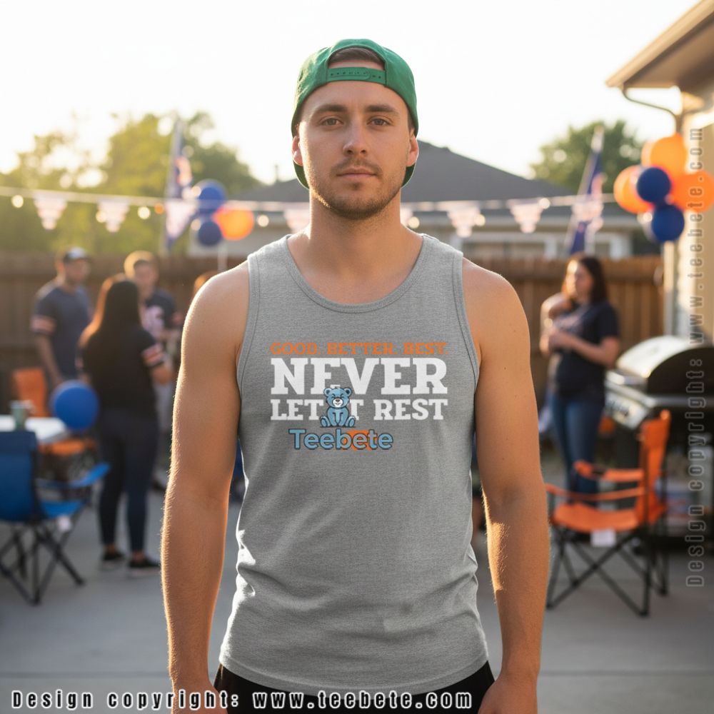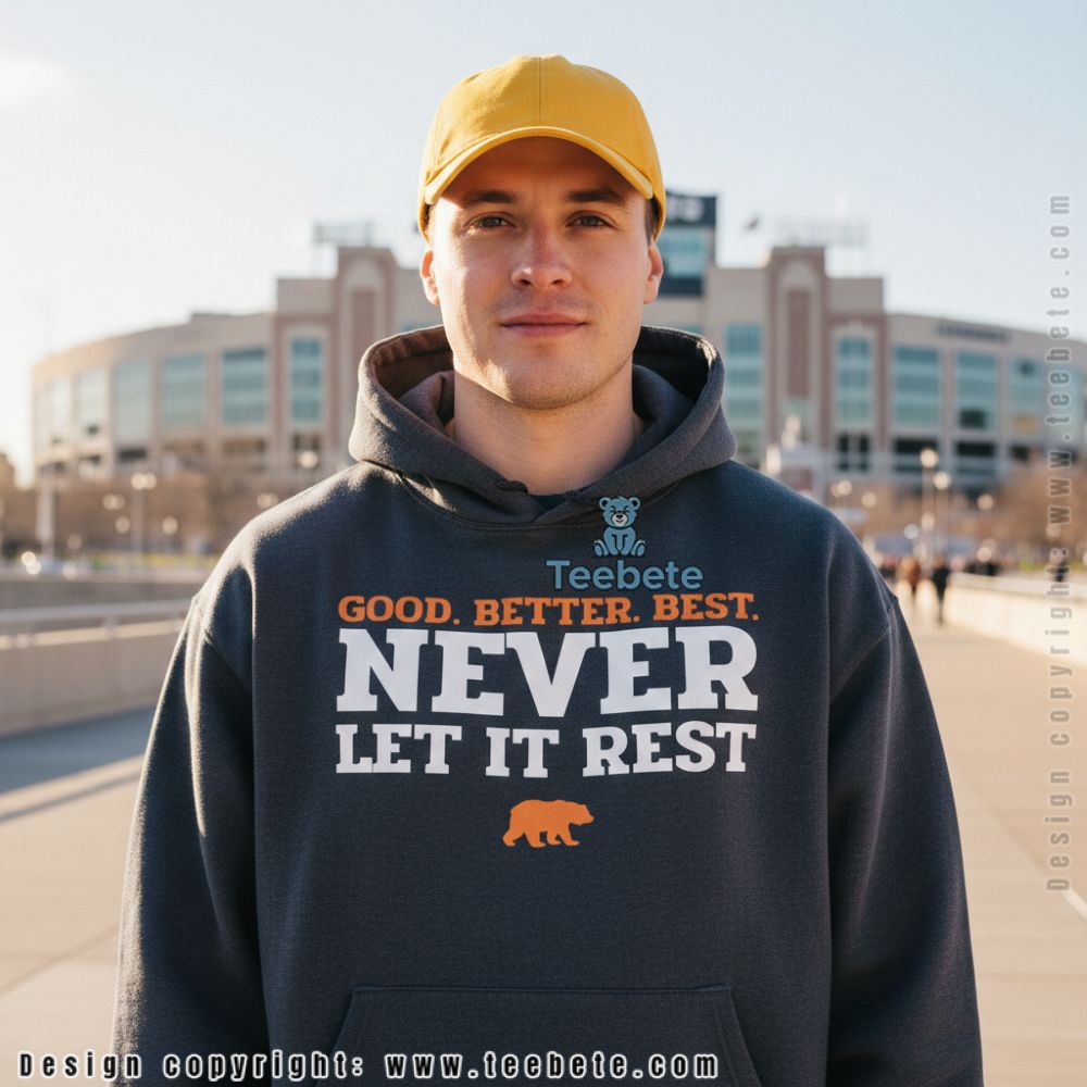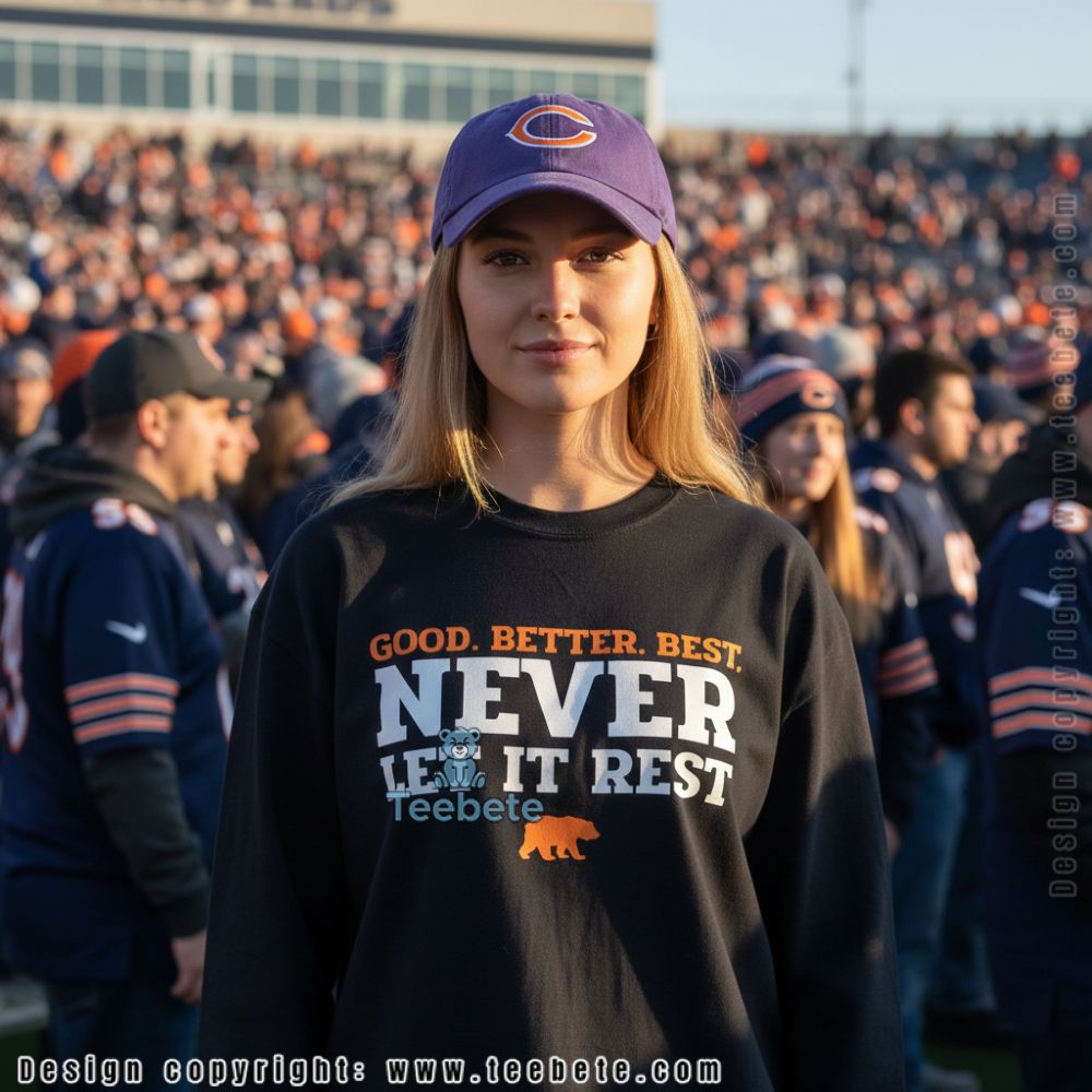 Crafted for fans who appreciate bold expressions, the Chicago Bears Good Better Best Never Let It Rest Shirt showcases an impressive arrangement of graphics and text that capture the spirit of team pride. The shirt presents a striking design with a layered collage style, highlighting dynamic typography set against a contrasting color palette that emphasizes the team’s iconic hues. Each detail is designed to pop, making it an eye-catching choice for a casual day out or game day gatherings.