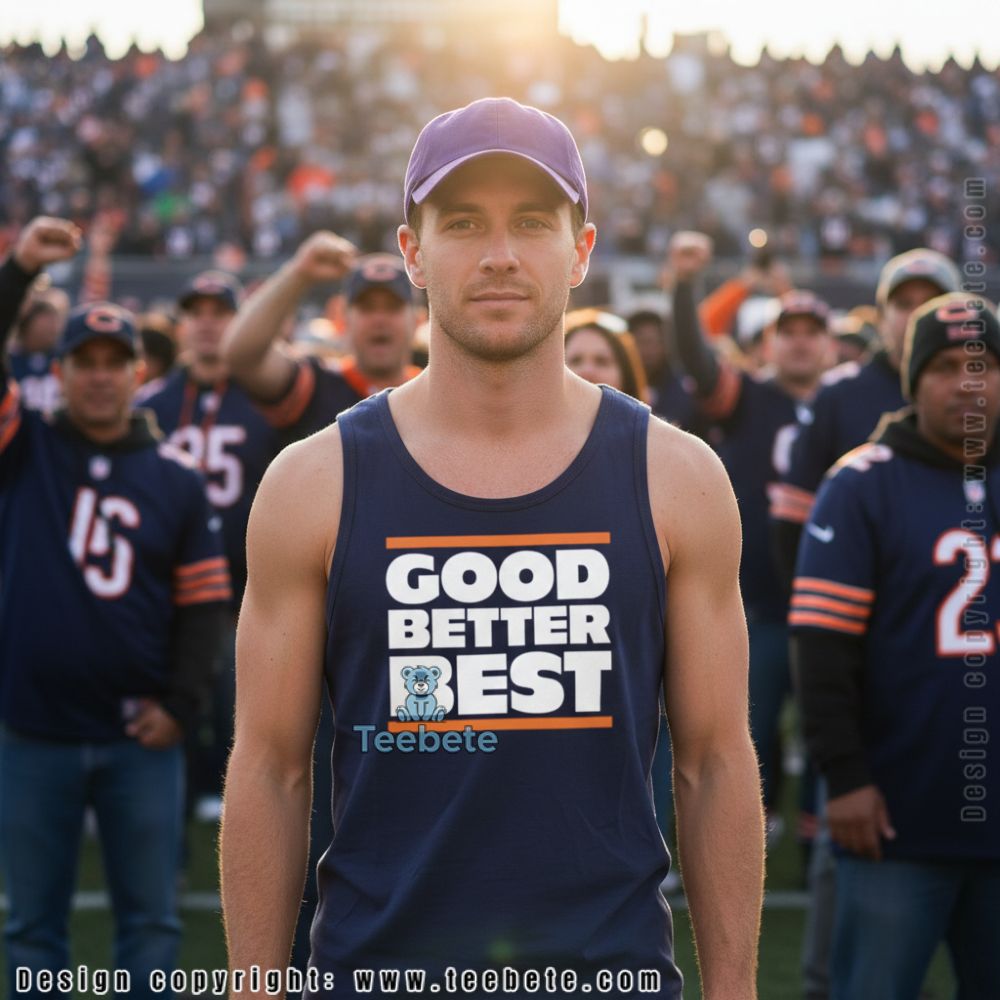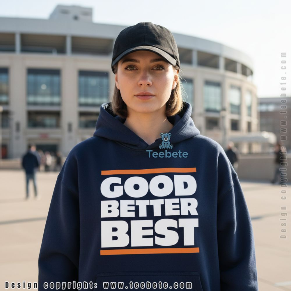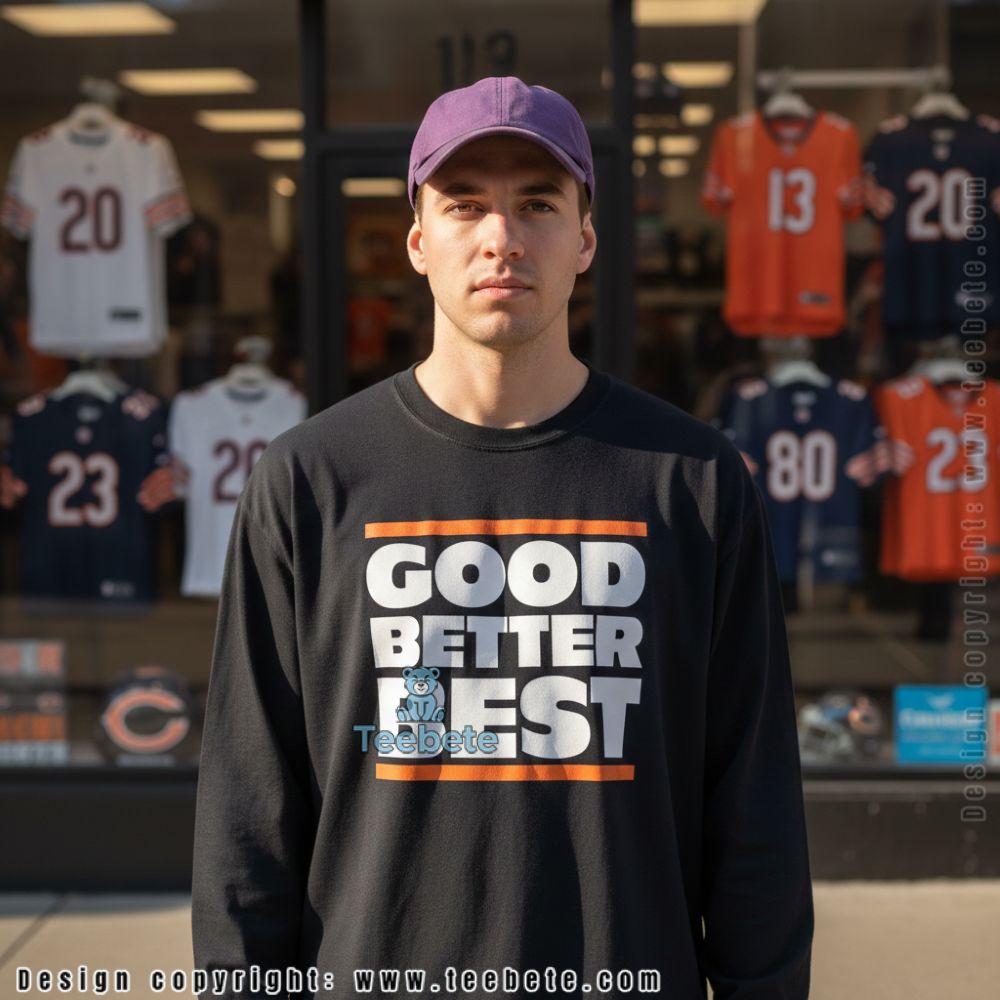 Capturing the essence of sports pride, the Chicago Bears Good Better Best Shirt showcases a dynamic and bold design. This striking T-shirt features an engaging layout where layered graphics interweave with attention-grabbing icons and text celebrating the team’s spirit. The expertly arranged imagery contrasts beautifully with a color palette that prominently incorporates iconic bear hues, ensuring that it stands out. The full-surface printing technique enhances every detail of the design, making it a visually arresting choice for fans.
