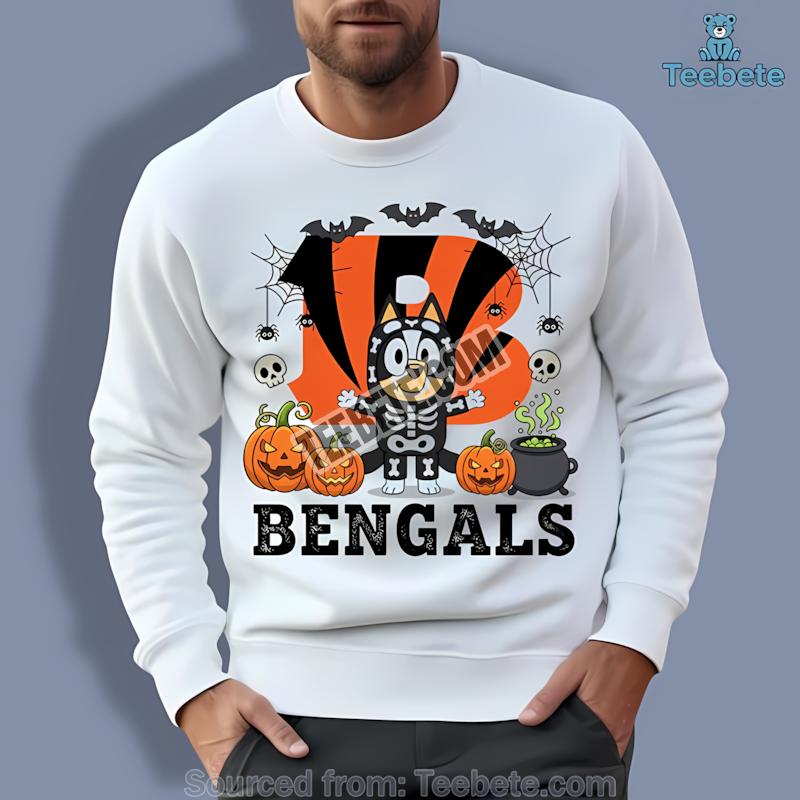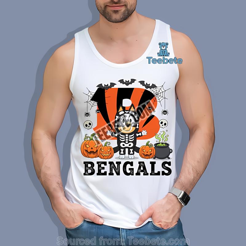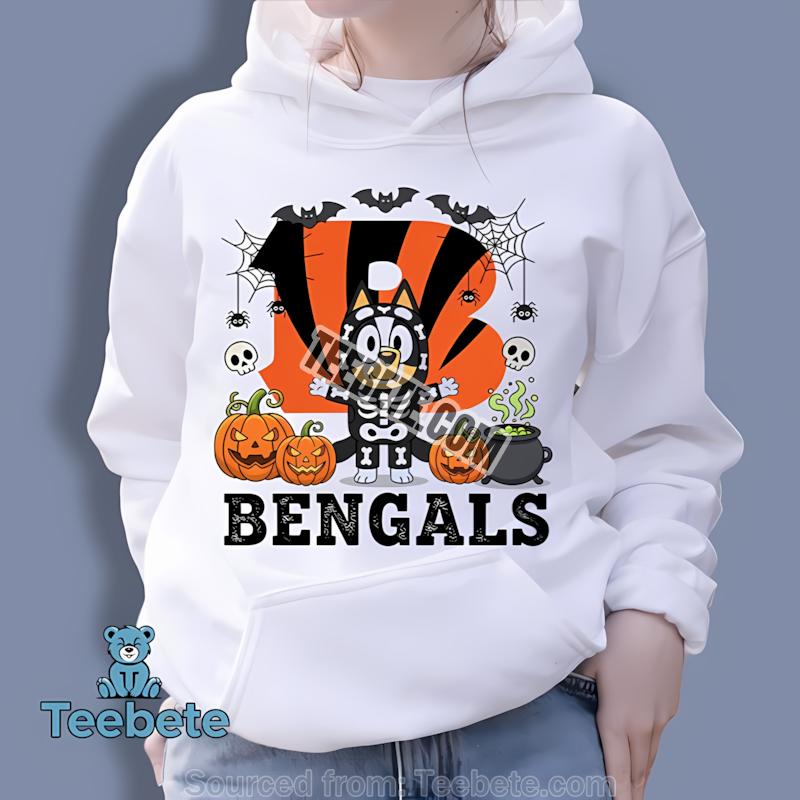 Elevate your game day experience and holidays with the Cincinnati Bengals Bluey Bingo Skeleton Pumpkin Halloween Shirt from Teebete. Don’t wait! Show your support and creativity this season—buy yours now!