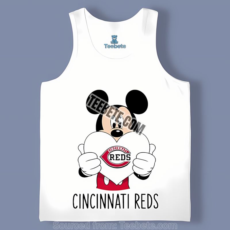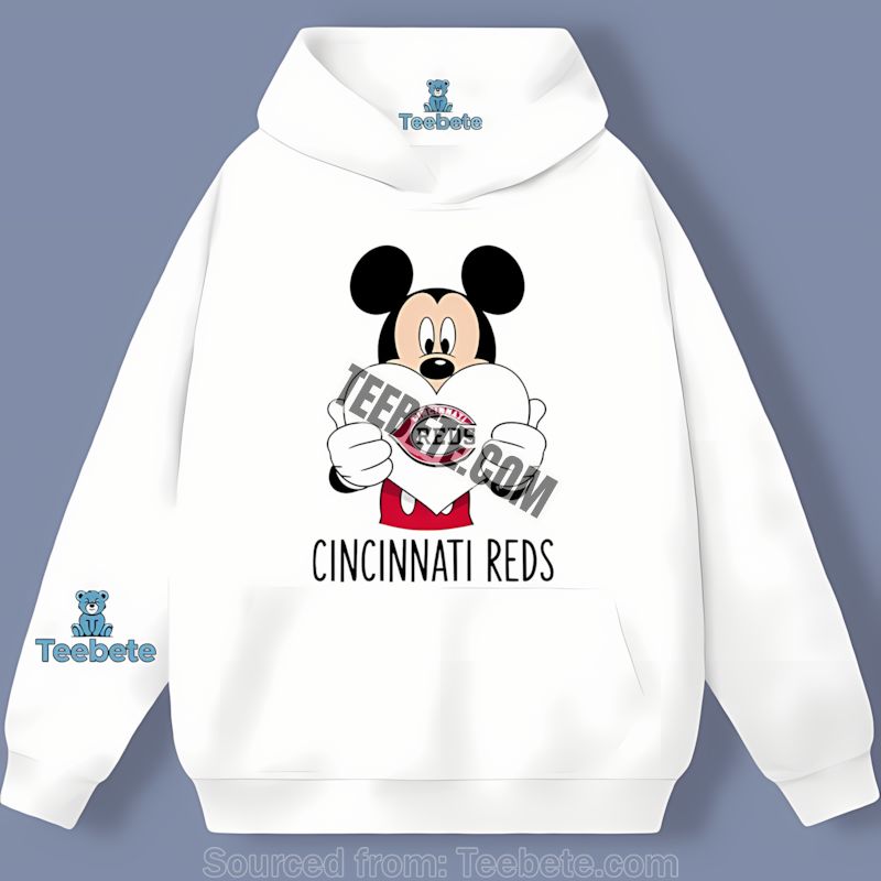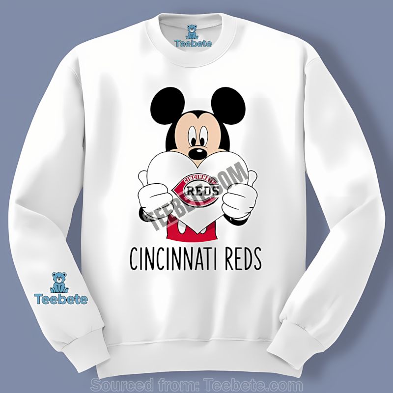 The heart shape, a universal symbol of love and passion, serves as the perfect canvas to unite the Reds’ iconic logo with Mickey Mouse’s playful charm. It’s a design that’s sure to resonate with fellow Reds fans and Disney enthusiasts alike. This unique combination of nostalgic charm and team spirit makes this more than just a shirt; it’s a statement piece that speaks volumes about your fandom.