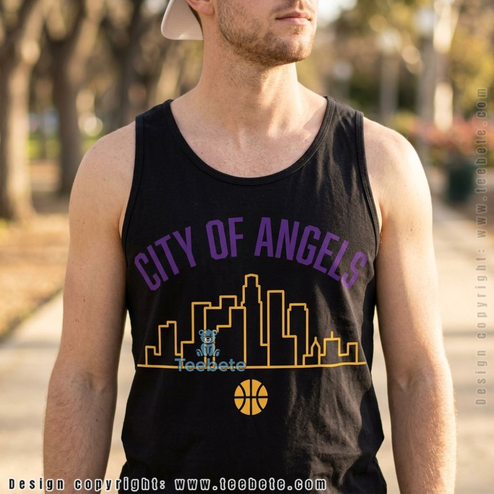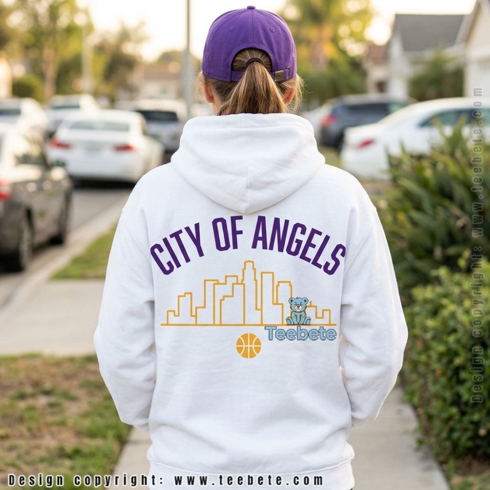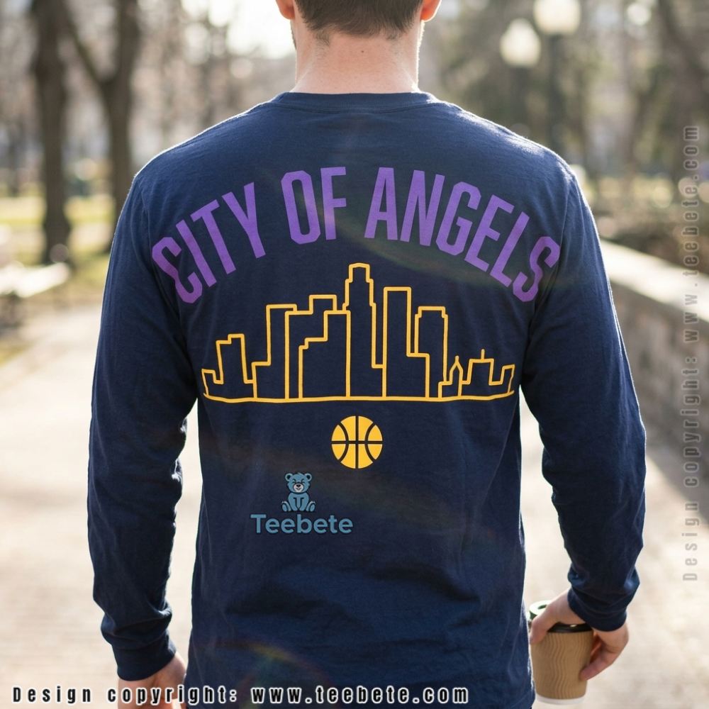 Contemporary urban aesthetics shape the design ethos here: the skyline and basketball illustrations are executed with precise linework, presenting a sleek, modern interpretation of LA’s iconic imagery. The interplay of light and shadow within the skyline elements enhances the sense of depth, giving the shirt a three-dimensional quality when viewed from different angles. This careful rendering not only defines the garment’s character but also invites closer inspection, rewarding viewers with intricate details hidden within the overall composition.