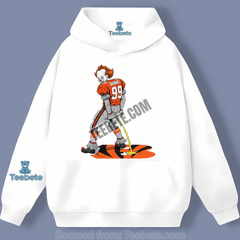 Halloween is a time for thrills, chills, and team pride, especially when it comes to showcasing your loyalty in style. Inspired by a blend of horror themes and spirited football rivalries, the Cleveland Browns Pennywise Vs Bengals Rivalry Halloween Design Shirt captures the essence of good-natured competition between the Cleveland Browns and Cincinnati Bengals. This unique design creatively merges the eerie charm of Halloween with the excitement of NFL rivalries, making it the perfect addition to your fan gear this spooky season.