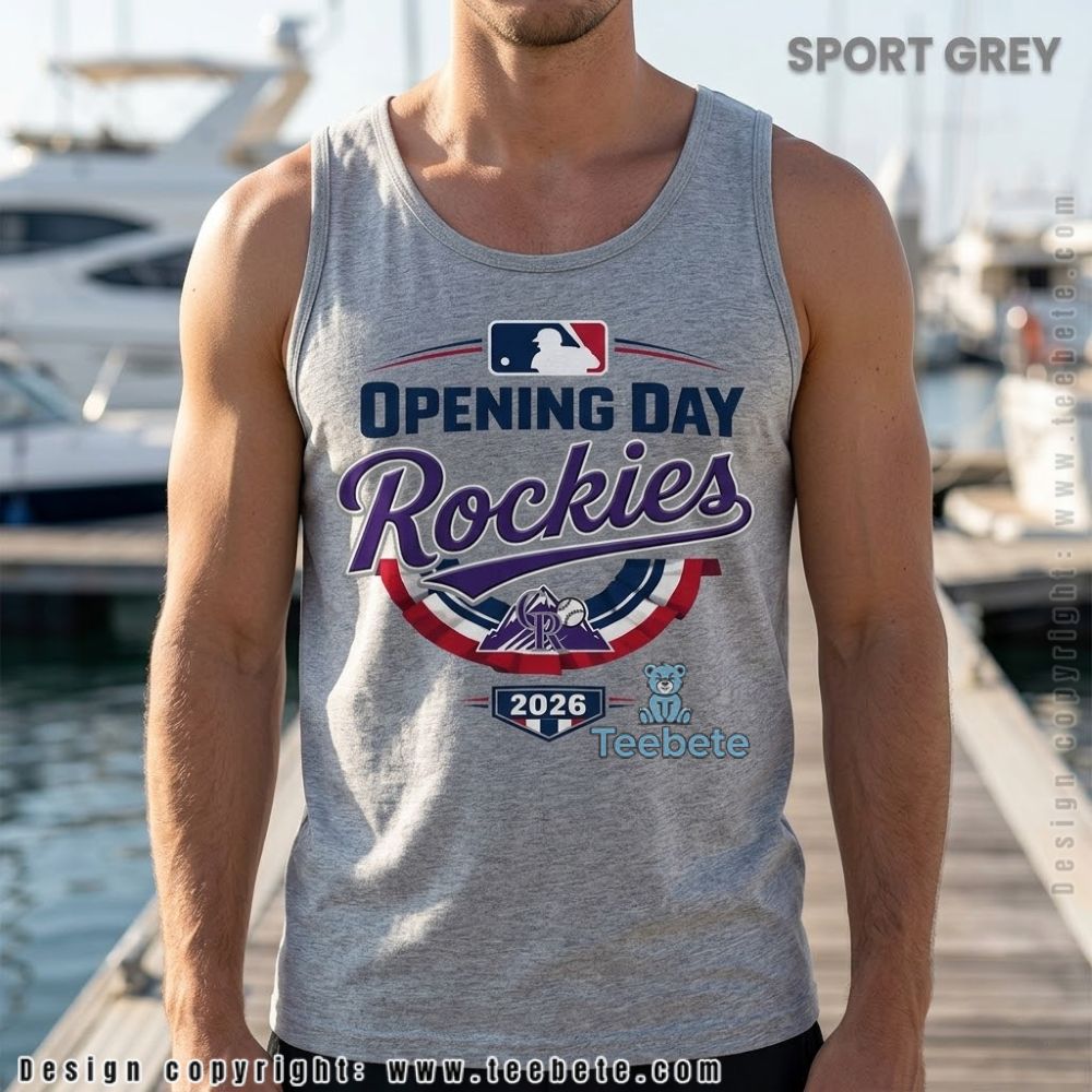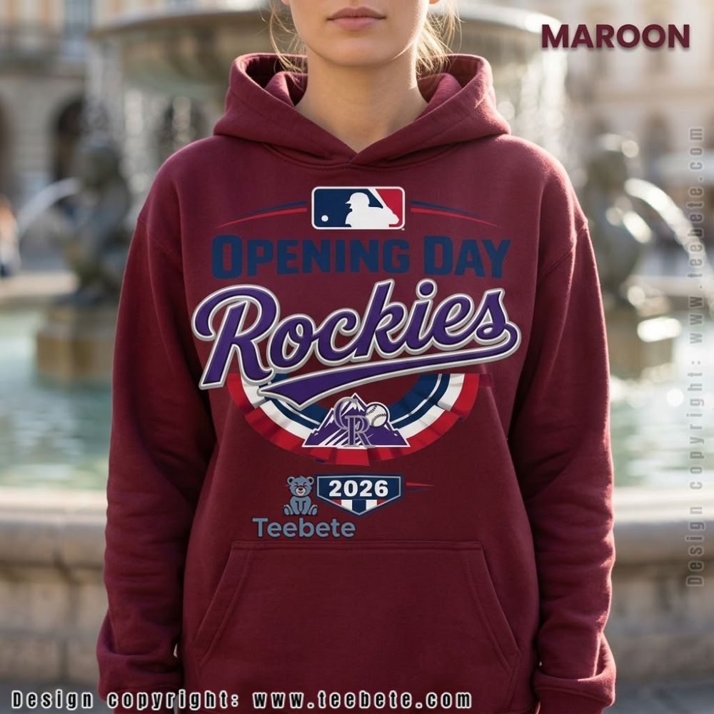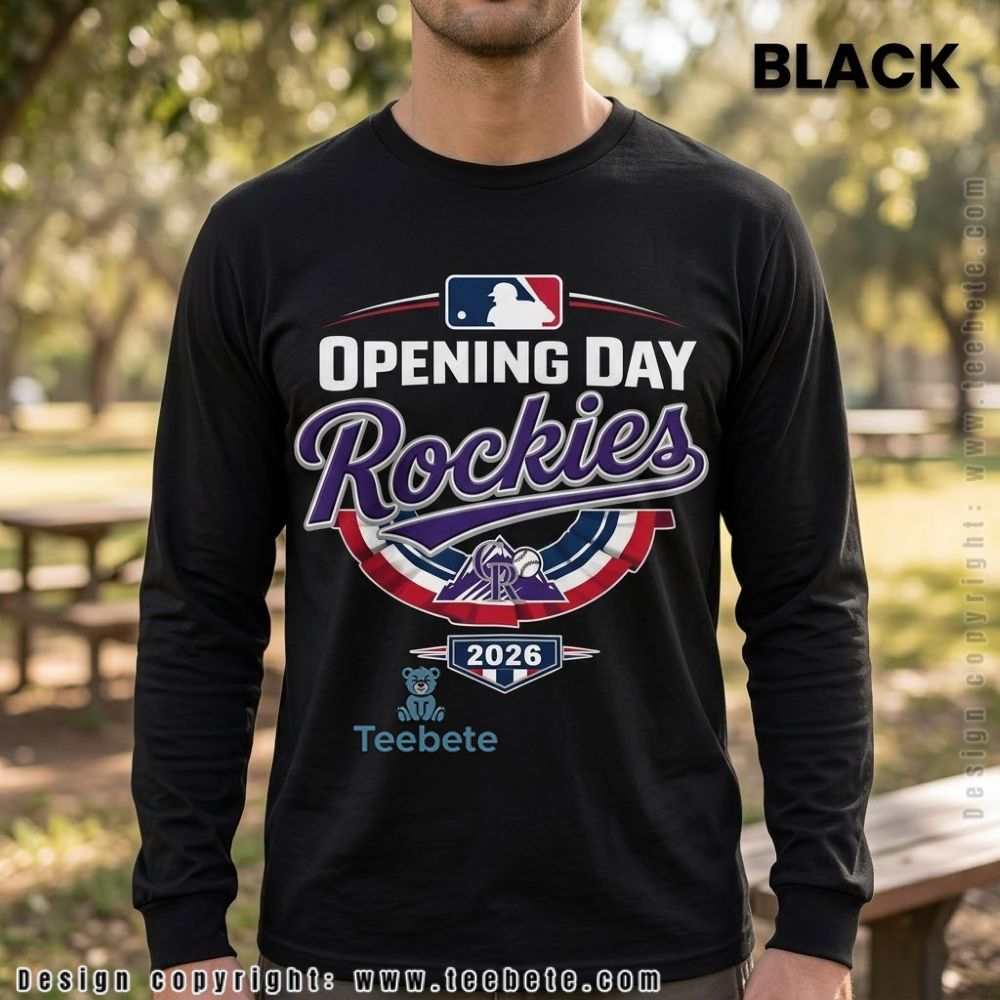 Circling the front of this shirt is a lively depiction celebrating baseball’s most anticipated event—Opening Day. The Colorado Rockies Baseball Opening Day 2026 Shirt is adorned with a vibrant arrangement of team colors, featuring a dynamic stylized logo at its center. Surrounding imagery includes playful baseball motifs and familiar symbols that evoke the excitement of the season’s first pitch. The full-coverage print technique ensures these elements leap off the fabric, making the shirt an eye-catching choice for dedicated fans.
