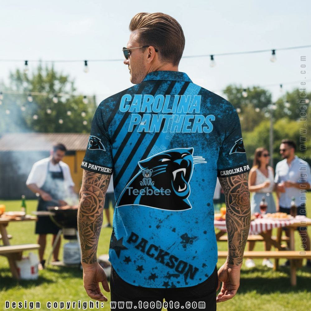 Dynamic diagonal stripes cut across the Custom Name and Number Carolina Panthers Striped Hawaiian Shirt, creating bold geometric movement in electric blue and black tones. “PANTHERS” text dominates the upper chest area in varsity-style lettering, while customizable elements include a large jersey number “8” and personalized name “JACKSON” positioned prominently throughout the design. Panthers logos appear on both sleeves with “CAROLINA PANTHERS” sleeve bands, while the back features an oversized team logo beneath “CAROLINA PANTHERS” text. Stars scatter across the composition, adding depth to the distressed texture overlay that gives the surface a vintage, worn appearance. This Hawaiian shirt employs full-coverage sublimation printing with classic camp collar styling and button-front closure, creating a jersey-inspired look within tropical shirt formatting.