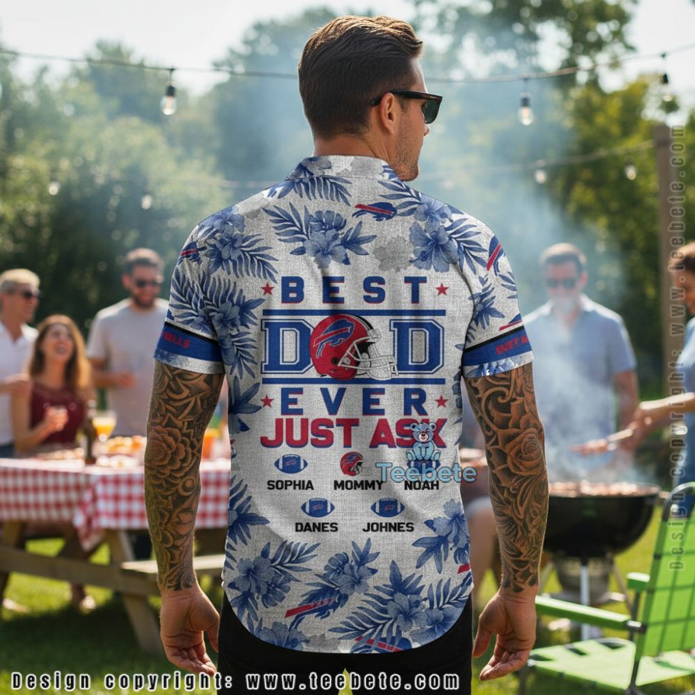 Featuring an engaging blend of eye-catching graphics, the Custom Name Best Dad Ever Just Ask Buffalo Bills Floral Hawaiian Shirt showcases a lively assortment of floral designs intertwined with spirited elements that represent the Buffalo Bills. This Hawaiian shirt is adorned with a full-surface, all-over print, harmoniously balancing vibrant colors that pop against a backdrop of soft pastels. The intricate arrangement highlights playful icons and text not only celebrates fatherhood but also pays homage to sports fandom, seamlessly merging fun with style.
