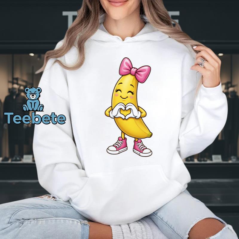 The overall aesthetic embodies a cheerful and light-hearted style, perfect for fun occasions where you want to stand out. This T-Shirt is ideal for sunny outings, casual gatherings, or as a quirky addition to everyday wear. The design taps into a playful theme that appeals to women and girls alike, making it a fantastic choice for anyone who appreciates humor in their apparel. Unique elements, such as the expressive Banana Girl and her charming heart hands, set this T-Shirt apart, ensuring it will quickly become a favorite for those who love fun and whimsical fashion.