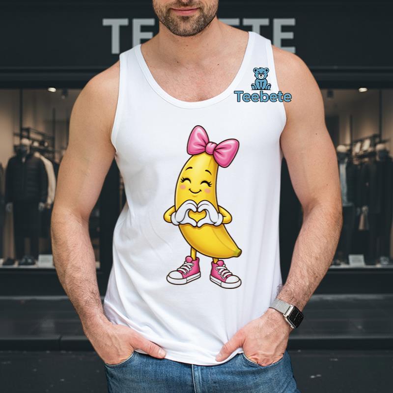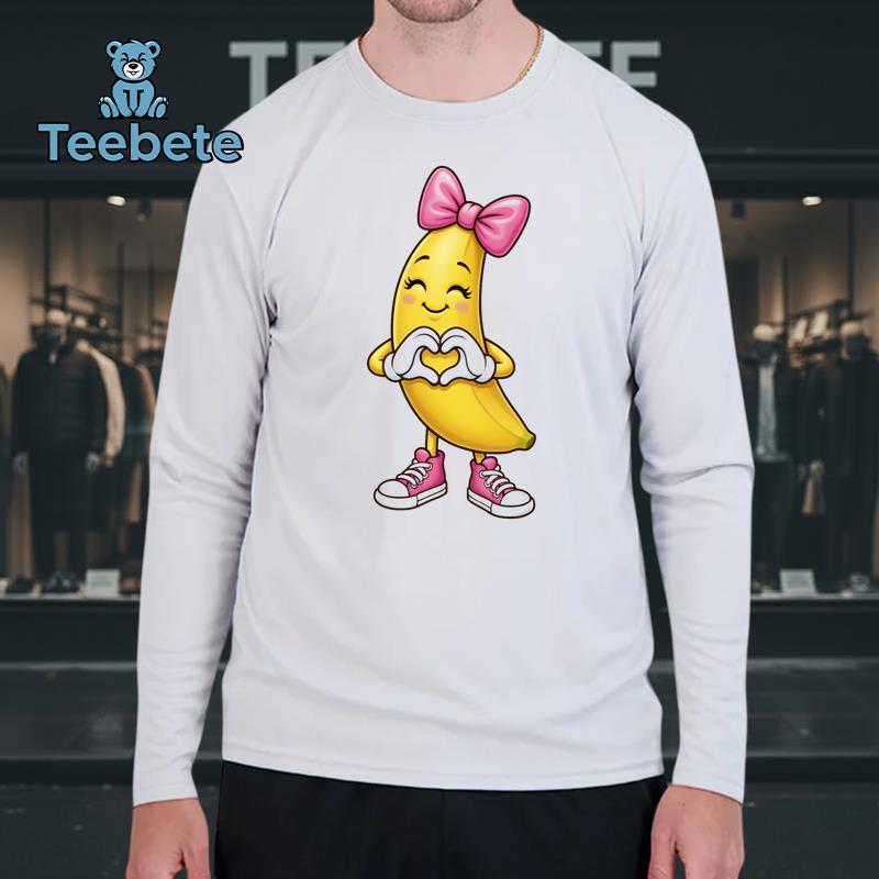 Splashing with personality, this T-Shirt features a delightful illustration of a Banana Girl, whose whimsical charm radiates through her animated expression. At the center of the design, the character sportingly displays her Pink Bow Heart Hands, creating a playful and humorous vibe. The arrangement combines bright yellows with soft pinks, creating an eye-catching contrast that makes the graphic pop against the fabric. The layout is balanced, ensuring that the fun imagery is easily visible from any angle, establishing the Pink Bow Heart Hands Banana Girl T-Shirt as a must-have for any casual wardrobe.