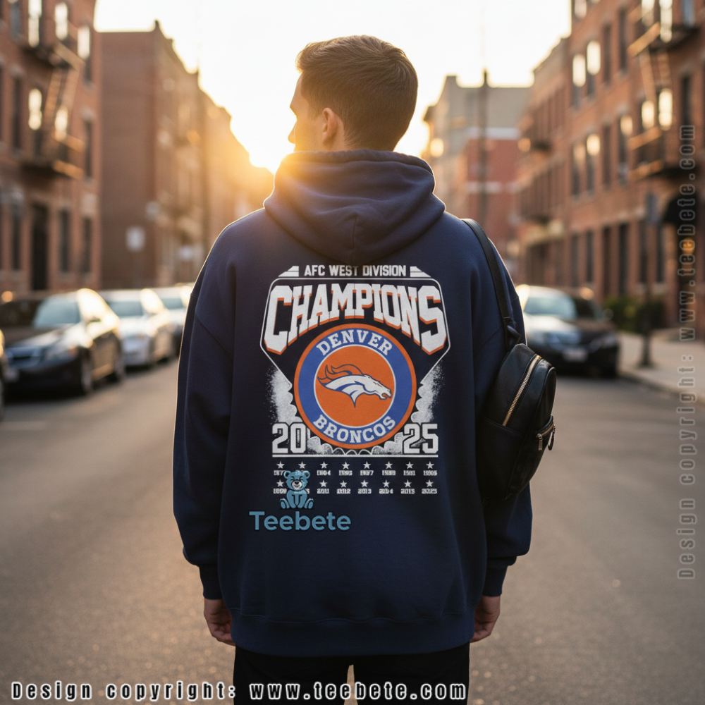 The design proudly displays “AFC WEST CHAMPIONS” in bold block lettering, marking the moment Denver ended the Chiefs’ nine-year reign over the division.