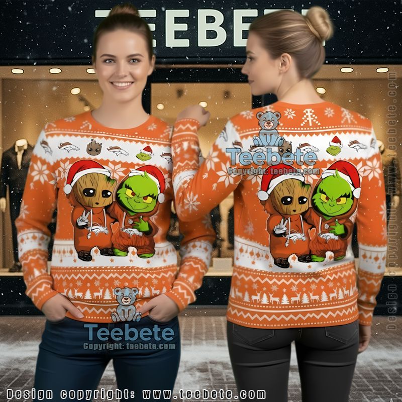 Make this holiday season special and memorable with the Denver Broncos Baby Groot Grinch Ugly Christmas Sweatshirt Orange White. It’s the perfect gift for fans young and old, capturing both team spirit and festive cheer. Don’t miss out on this must-have apparel—grab this delightful sweatshirt today!