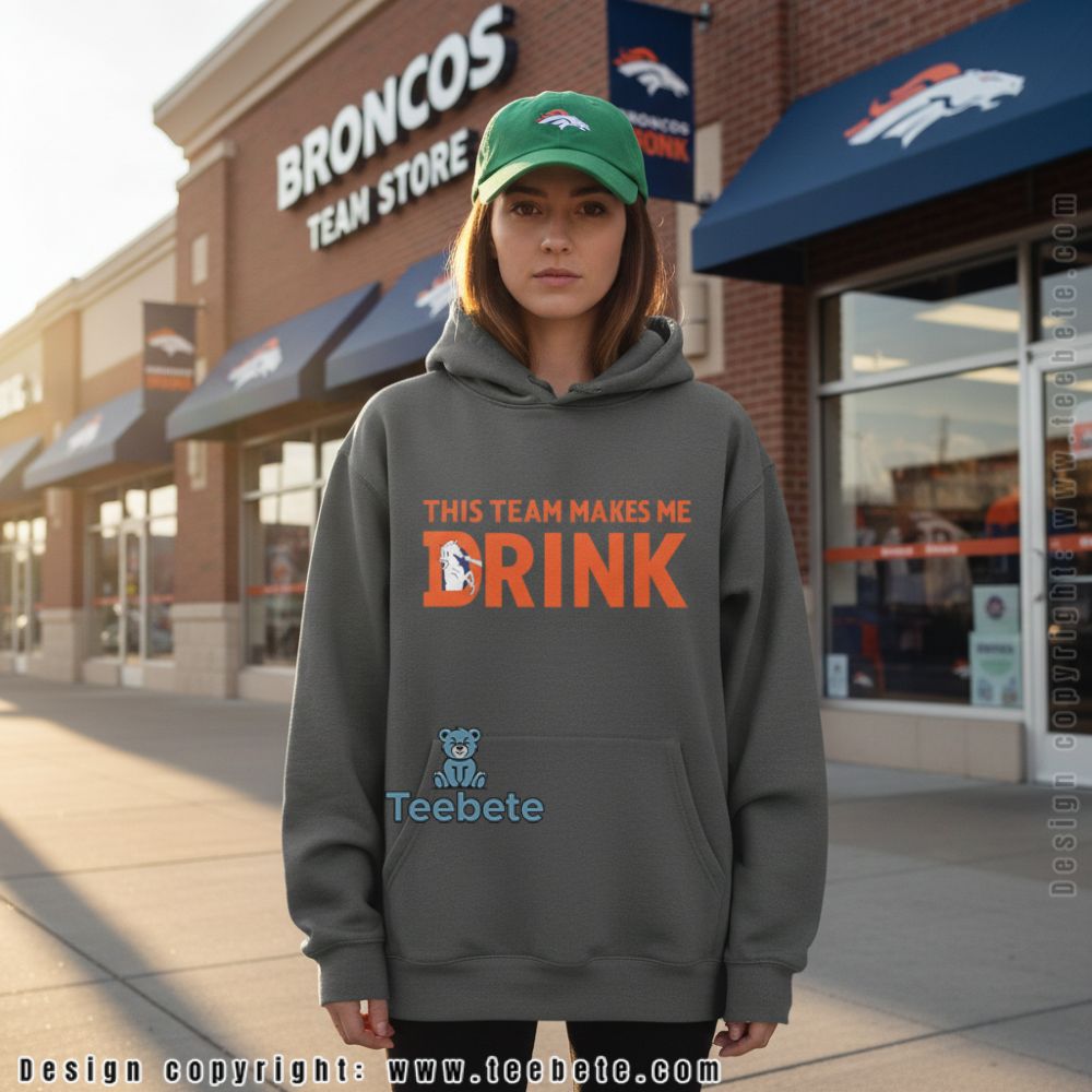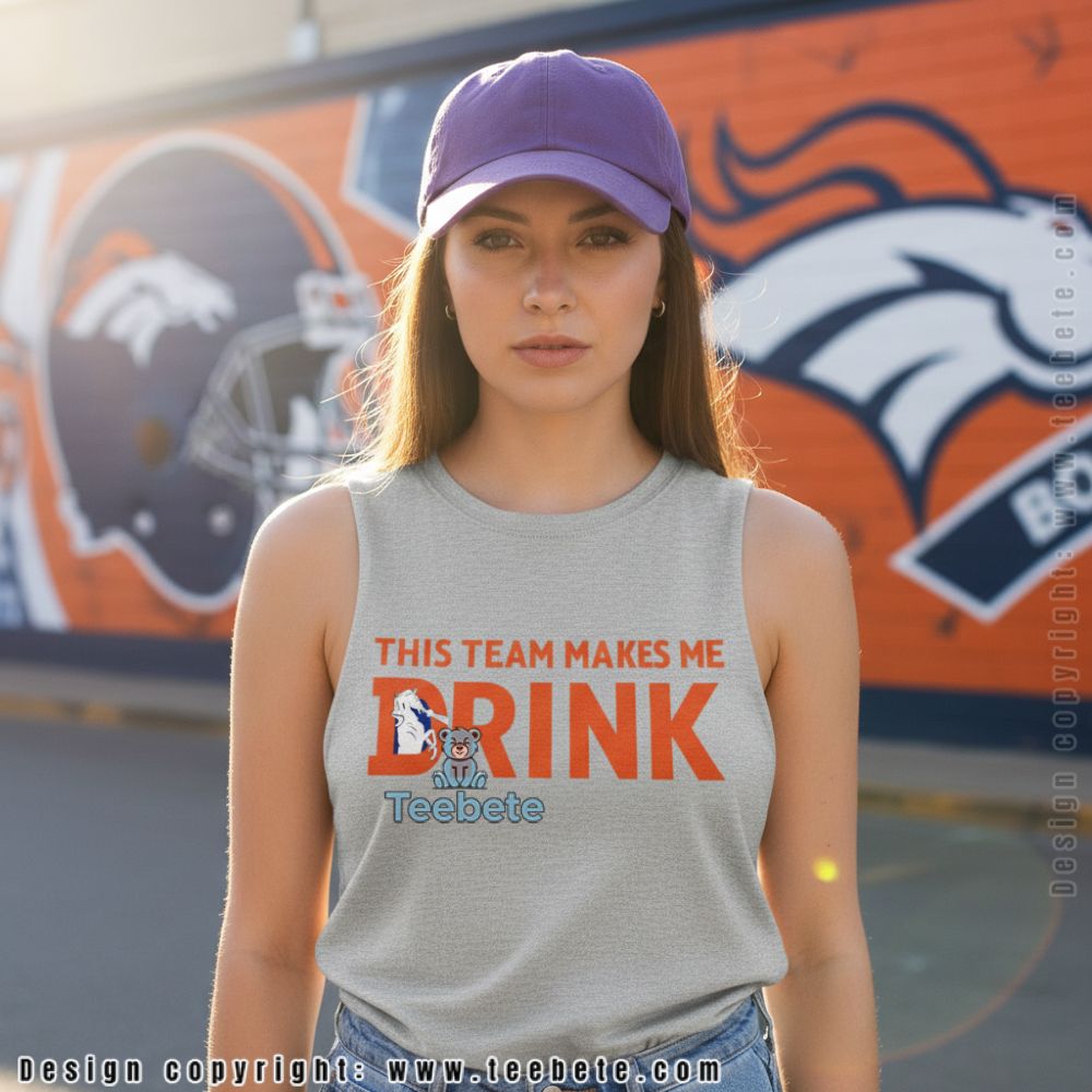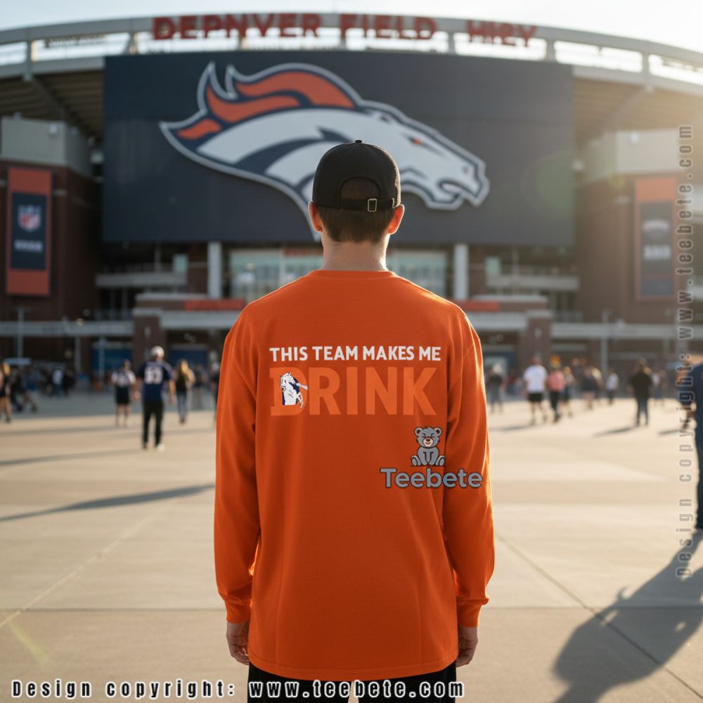 Frustrated Broncos fans get their perfect game day shirt with this humorous “THIS TEAM MAKES ME DRINK” design in bold orange lettering. Small Broncos logo sits inside the letter “D” in “DRINK,” keeping team branding visible while the joke takes center stage. The message captures every long-suffering fan’s reaction to nail-biting fourth quarters, questionable coaching calls, or seasons that test your loyalty more than celebrate victories.