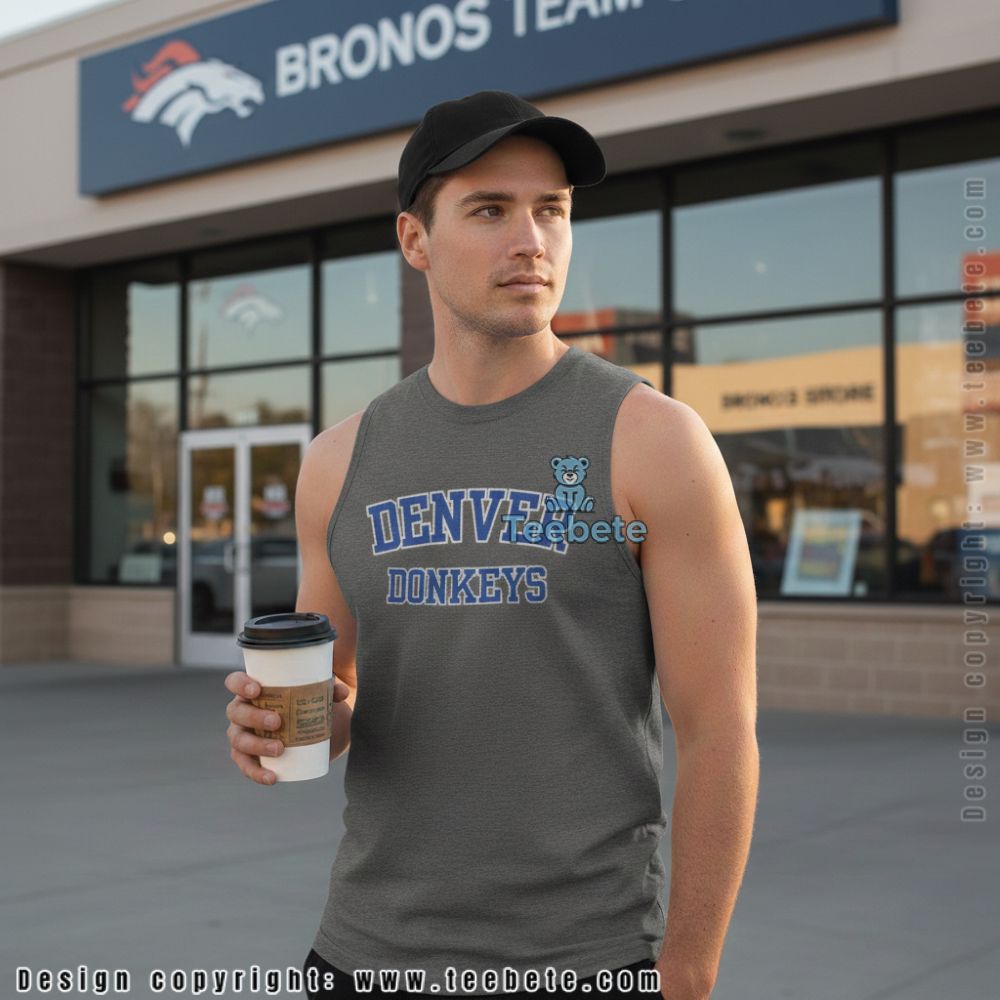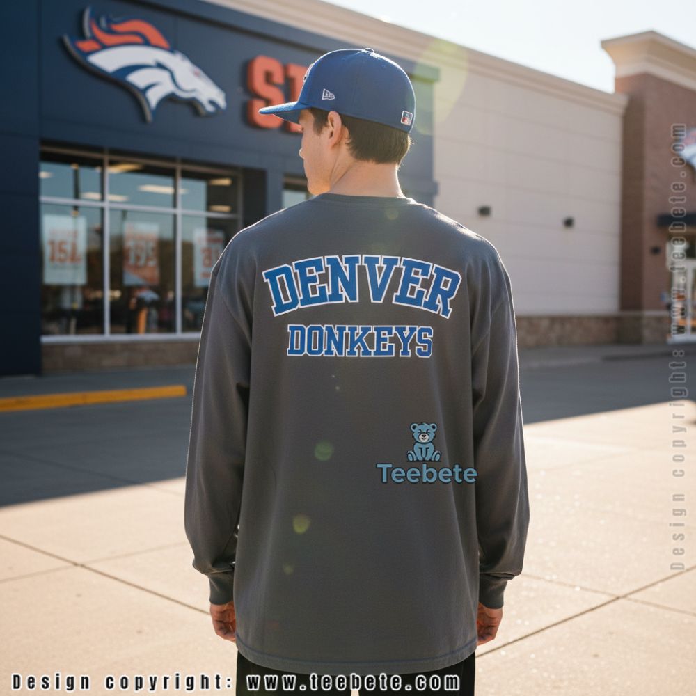 “DENVER DONKEYS” in arched varsity font looks legitimate enough from a distance that people do double-takes when they process what they’re actually reading. This is fan gear for people whose loyalty survives rebuilding seasons, coaching changes, and rough stretches where the jokes write themselves. Cotton fabric stays comfortable during tailgates where you’re explaining the shirt to confused strangers who can’t tell if you’re trolling or coping.