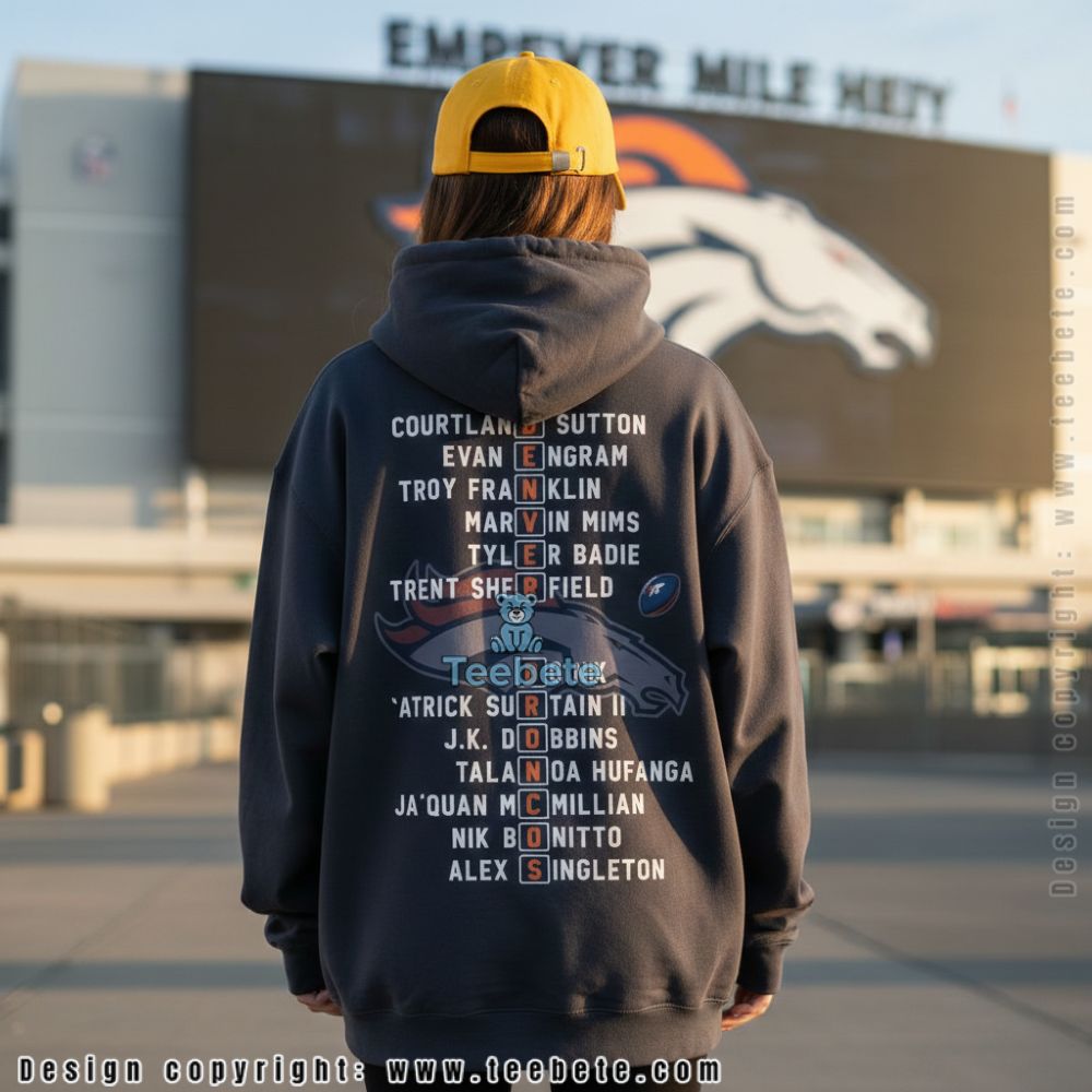 The crossword format creates interactive apparel that rewards closer inspection, separating fans who study rosters from people who only know quarterbacks. Names like Courtland Sutton, Patrick Surtain II, and others populate the list, making this roster-specific rather than generic team merchandise. Orange letter highlights guide the eye while maintaining clean visual hierarchy that doesn’t overwhelm the composition.