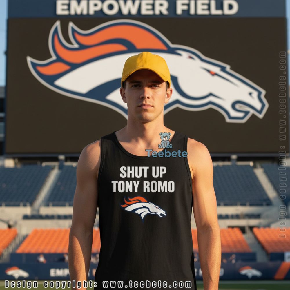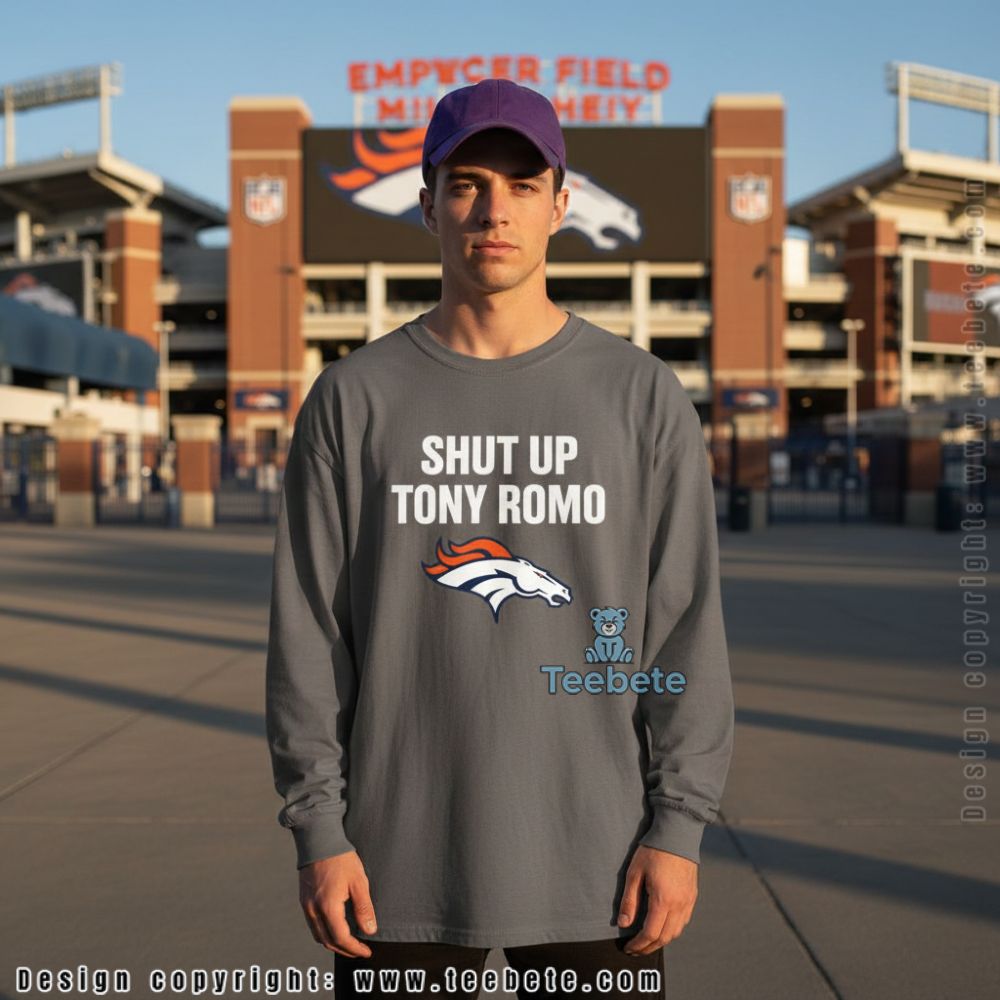 Some announcers need muting. This Denver Broncos Shut Up Tony Funny Shirt addresses commentary frustrations with direct “SHUT UP TONY ROMO” text above the Broncos logo, creating apparel for fans tired of hearing specific broadcast voices during their team’s games. Navy fabric keeps this wearable while the blunt message resonates with supporters who’ve spent too many Sundays disagreeing with booth analysis.