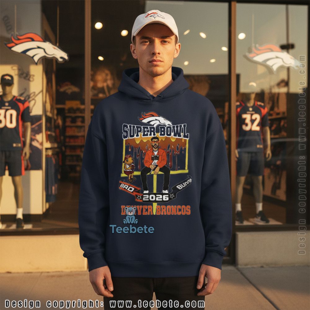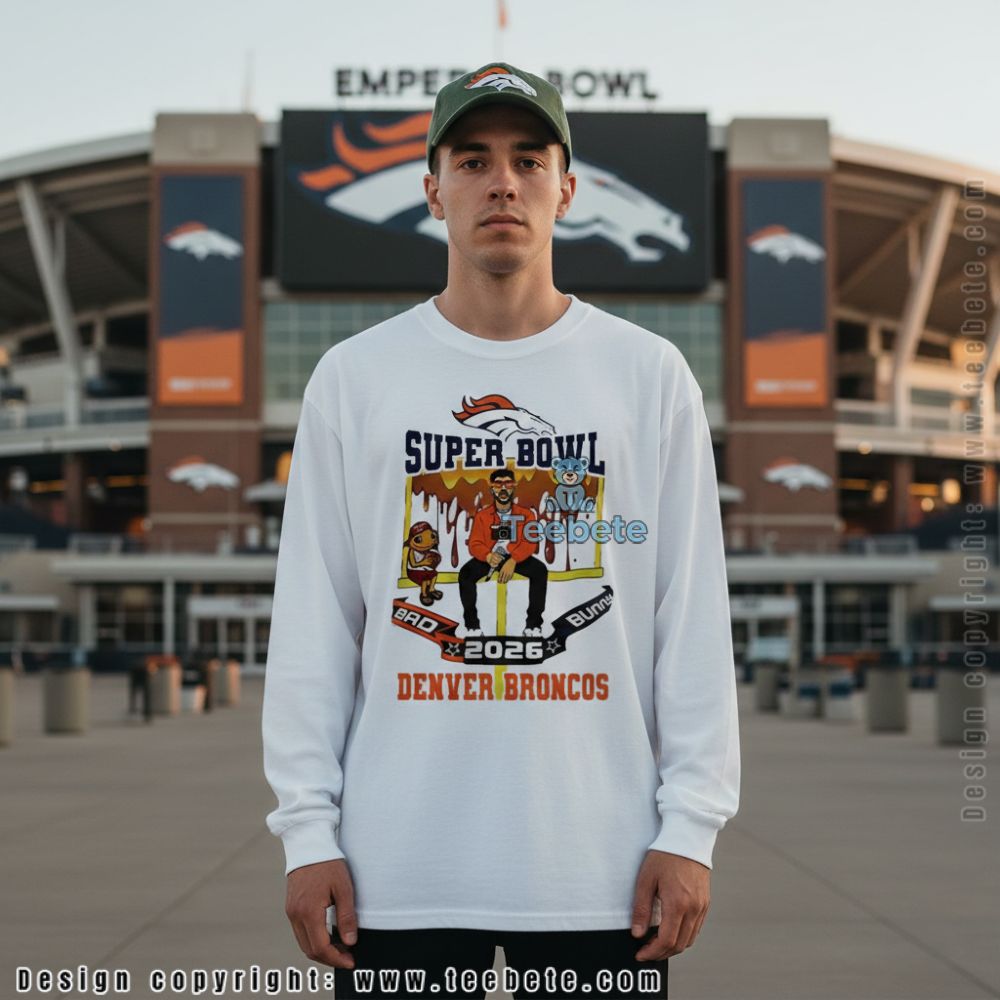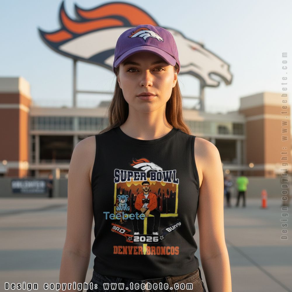 Halftime show meets hometown team in speculative merchandise. This Denver Broncos Super Bowl 2026 Bad Bunny Fan Shirt imagines a future where both Denver reaches the championship and Bad Bunny performs, creating crossover apparel for fans whose music taste and football loyalty don’t exist in separate boxes. The illustrated design shows Bad Bunny on a bench with Broncos branding and “2026” date stamp in charcoal gray.