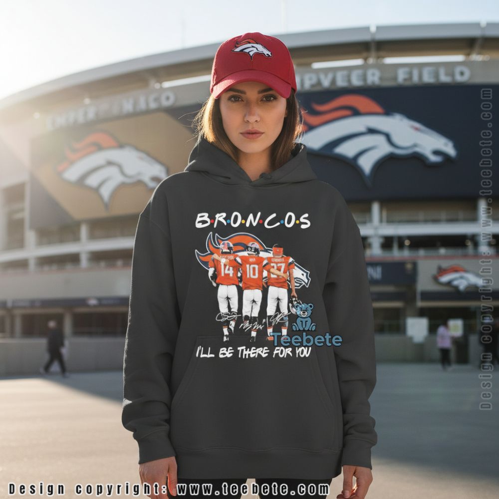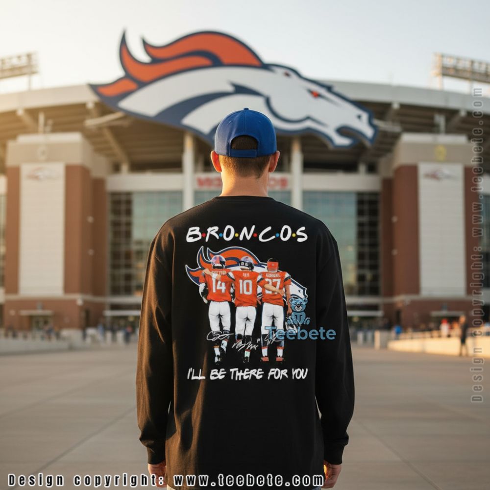 Player loyalty meets sitcom nostalgia in unexpected crossover. This Denver Broncos Sutton Nix Dobbins I’ll Be There For You Shirt features illustrated figures of Courtland Sutton (#14), Bo Nix (#10), and J.K. Dobbins in Broncos uniforms above the Friends theme song lyric “I’ll be there for you” on orange fabric. The design connects current roster support with recognizable pop culture reference that transcends sports.