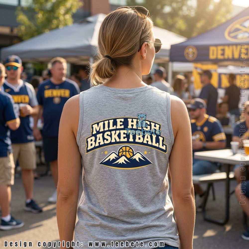 Bold and vibrant, the Denver Nuggets Mile High Basketball Shirt captures the spirit of basketball culture. This T-Shirt boasts a dynamic arrangement of graphics that feature the iconic team logo prominently in the center. The striking color palette incorporates deep blues and bright gold accents, giving it a fresh and lively contrast. Full-coverage print techniques highlight the intricate details of the design, enhancing visual depth through layered illustrative elements that celebrate the team’s identity.