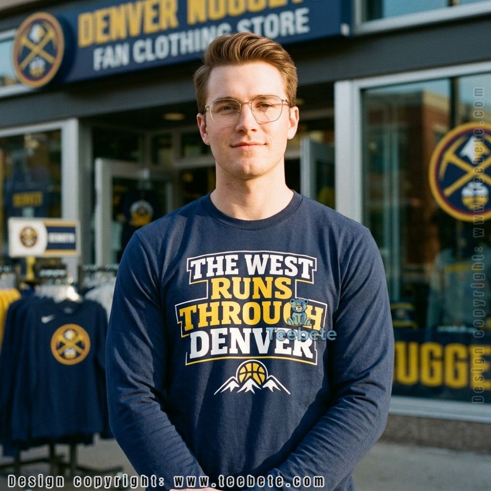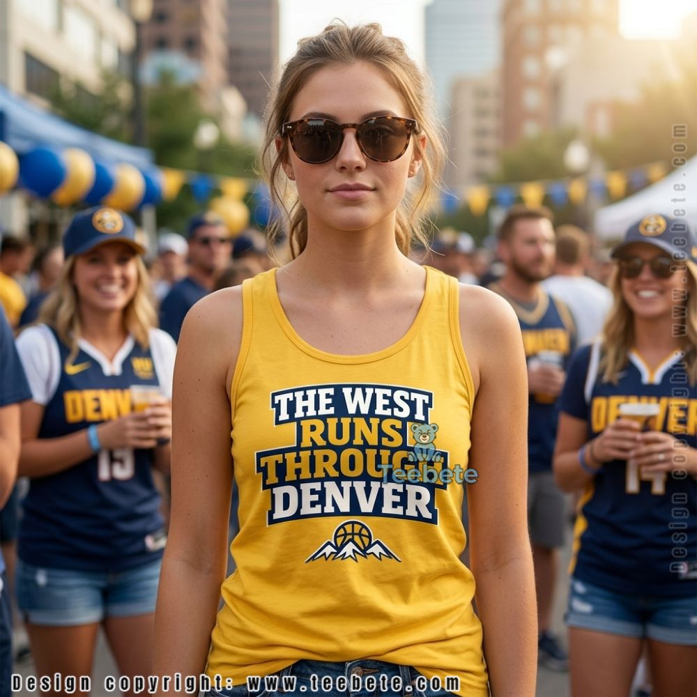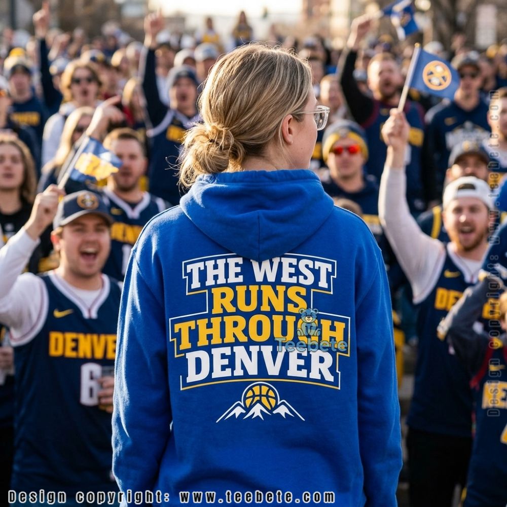 Denver Nuggets The West Runs Through Denver Shirt presents an eye-catching T-shirt design that captures the spirit of basketball culture. The front features a dynamic graphic layout with bold typography announcing “The West Runs Through Denver,” surrounded by vivid motifs representative of the Denver Nuggets. A rich color palette blends the team’s colors—deep blues and bright golds—creating striking contrasts that ensure the design stands out. The centered composition allows the artwork to make a statement, printed using high-quality techniques that enhance the visual depth and clarity.