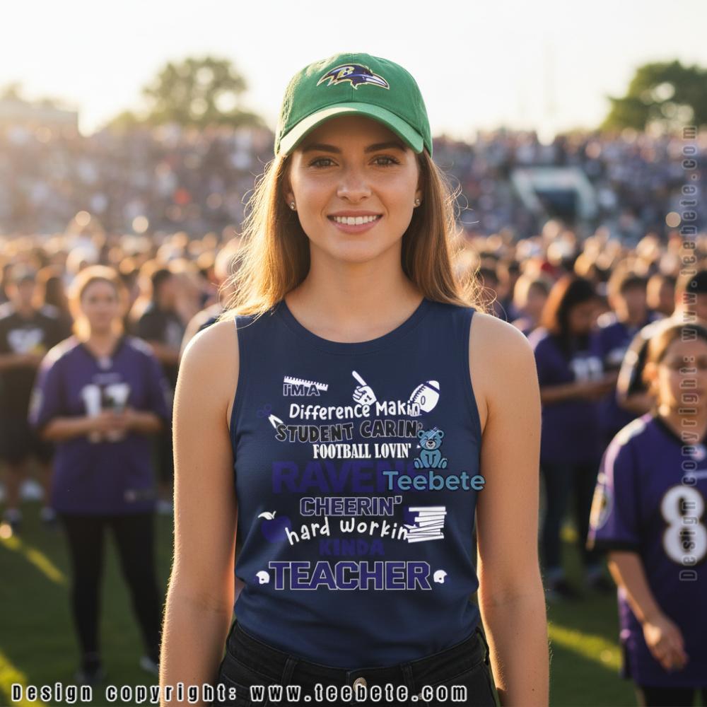 Designed for Baltimore Ravens fans who teach, this tee features a word collage including “Difference Makin,” “Student Carin,” “Football Lovin,” “Ravens Cheerin,” “Hard Workin,” and “TEACHER” in varied typography styles. Shown in black, this shirt is also available in multiple colors including purple, navy, and sport grey. The layered text design captures the multifaceted identity of educators who balance classroom dedication with unwavering Ravens loyalty.