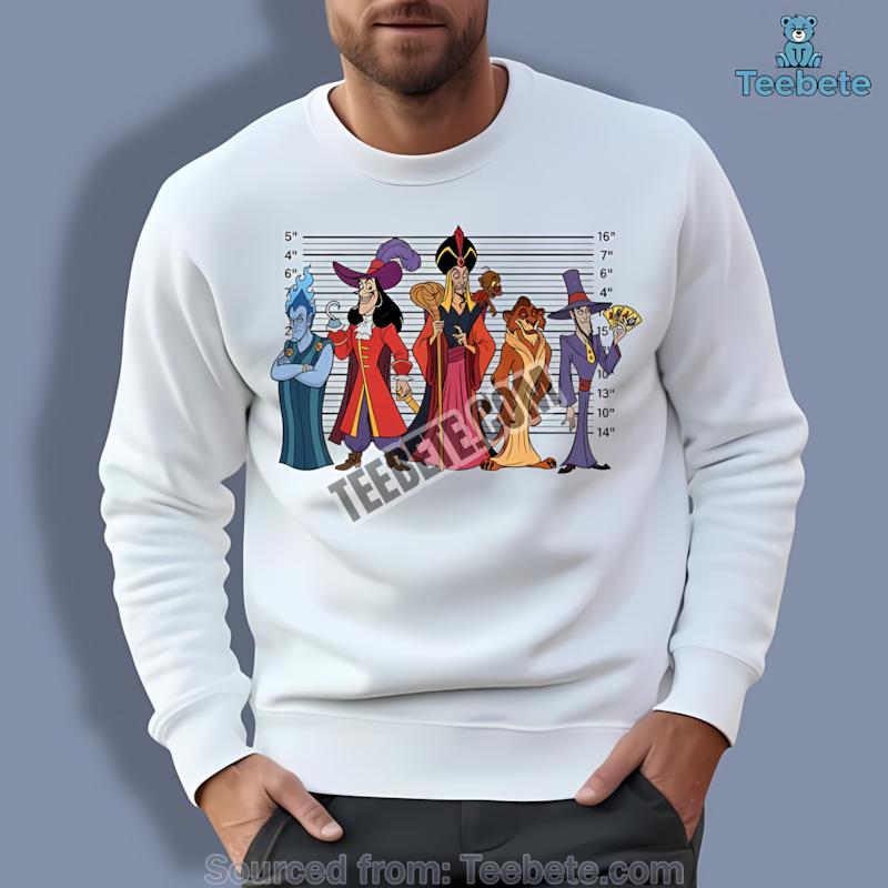 Don’t miss out on the chance to showcase your love for Disney’s most infamous characters. Elevate your wardrobe with this unique shirt today. Buy the Disney Villains Police Lineup Retro Halloween Mugshot Shirt now and wear your villainous charm proudly!
