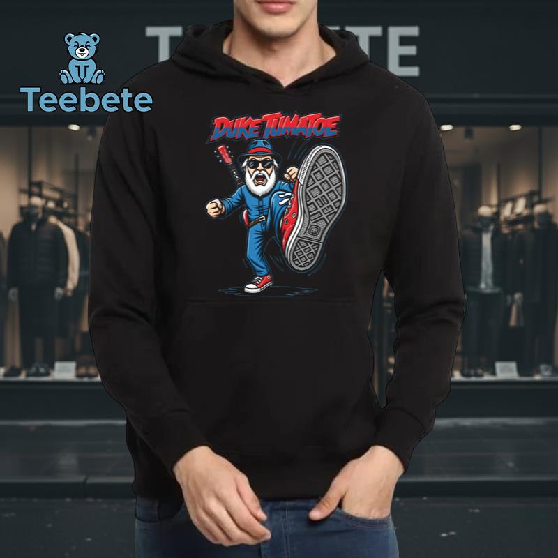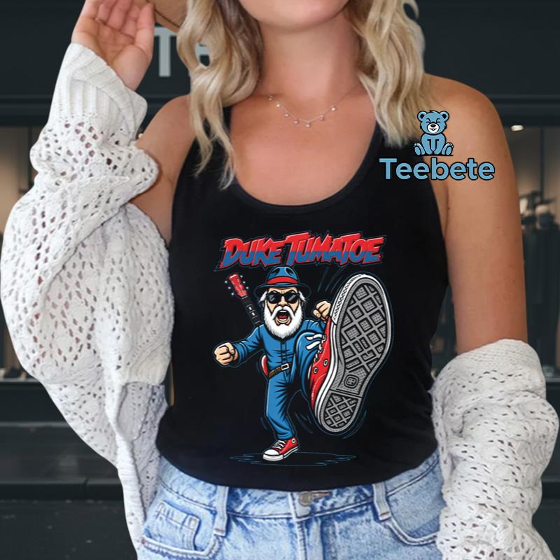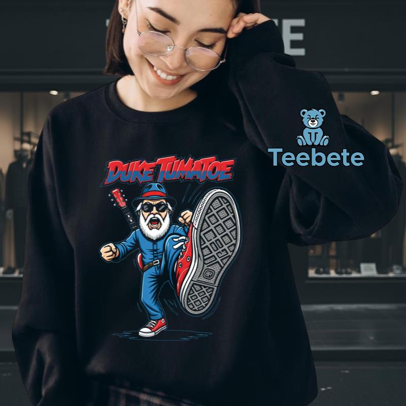 Infused with humor and a lighthearted vibe, this T-Shirt celebrates the playful spirit of rock music culture. The overall aesthetic reflects a fun, whimsical style that resonates with fans of all ages, making it a perfect choice for casual outings or concerts. Whether worn to a live show or just hanging out with friends, this design adds a touch of musical flair to any wardrobe. The charming, cartoonish representation of Duke Tumatoe ensures this piece not only resonates with music fans but also makes a fantastic conversation starter on any occasion.