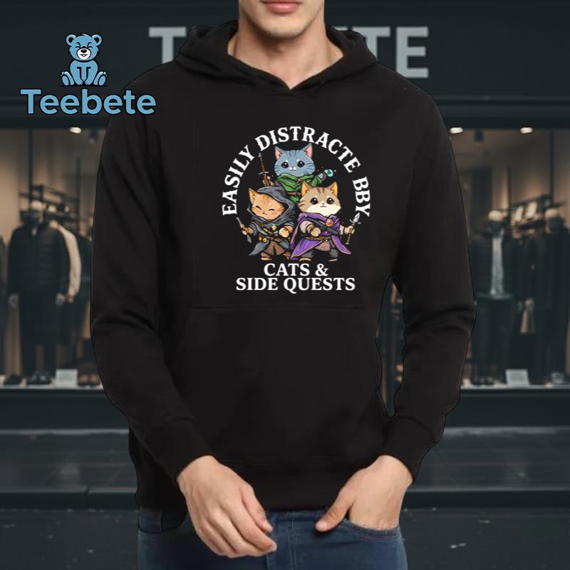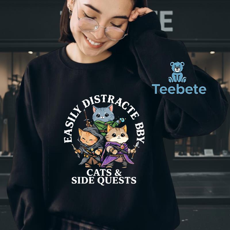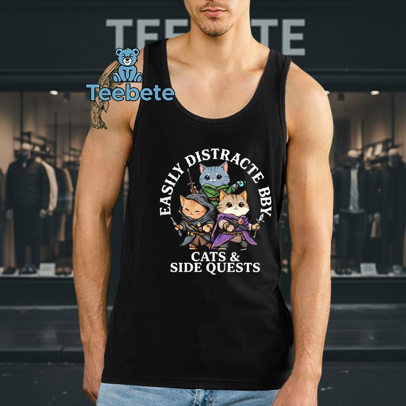 A whimsical design element dominates this T-Shirt, showcasing an amusing interaction between cats and gaming. The Easily Distracted By Cats And Side Quests Funny Gamer Cat Shirt features a delightful arrangement of cute feline illustrations, each playfully engaged in various gaming scenarios. The vibrant color palette combines bold hues of blue and green, expertly contrasted against a neutral background, creating a fun visual punch. Layered graphics evoke a sense of dynamic energy, while the center graphic composition draws attention to the playful theme that resonates well with any gaming enthusiast.