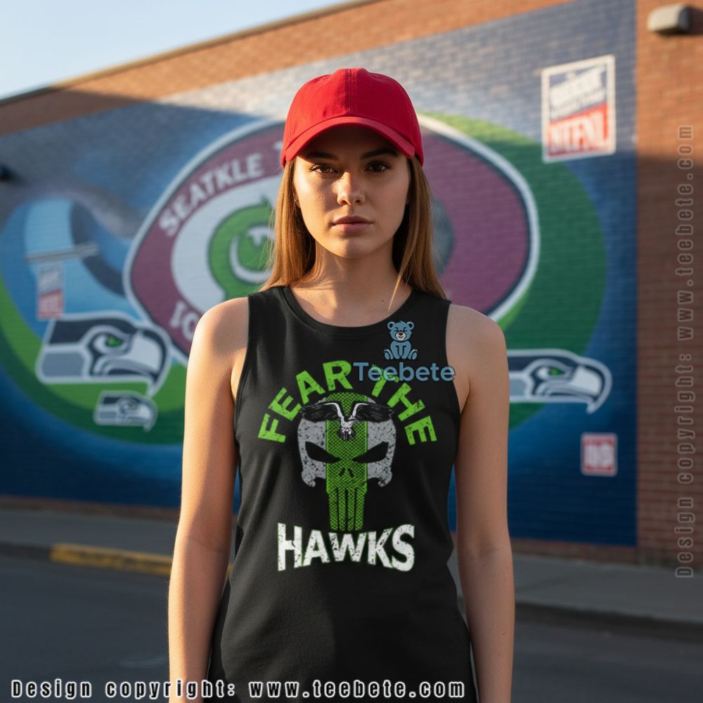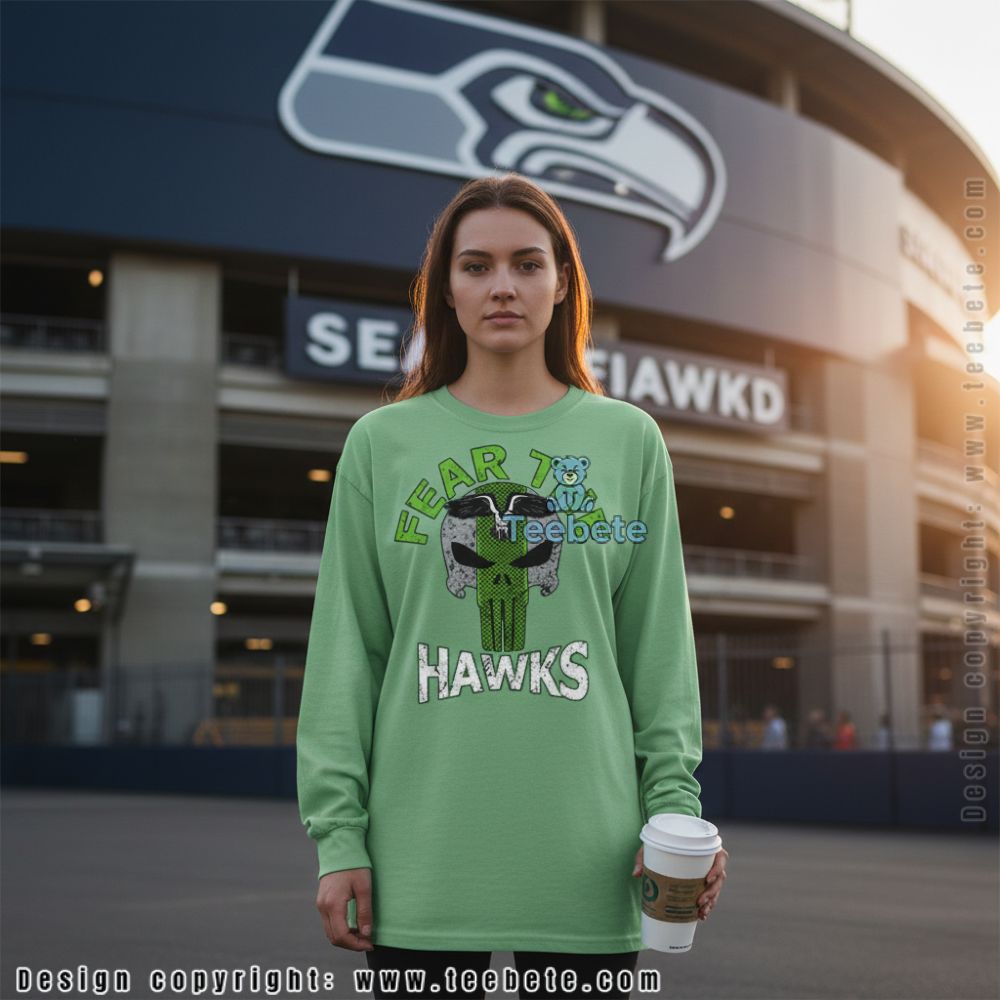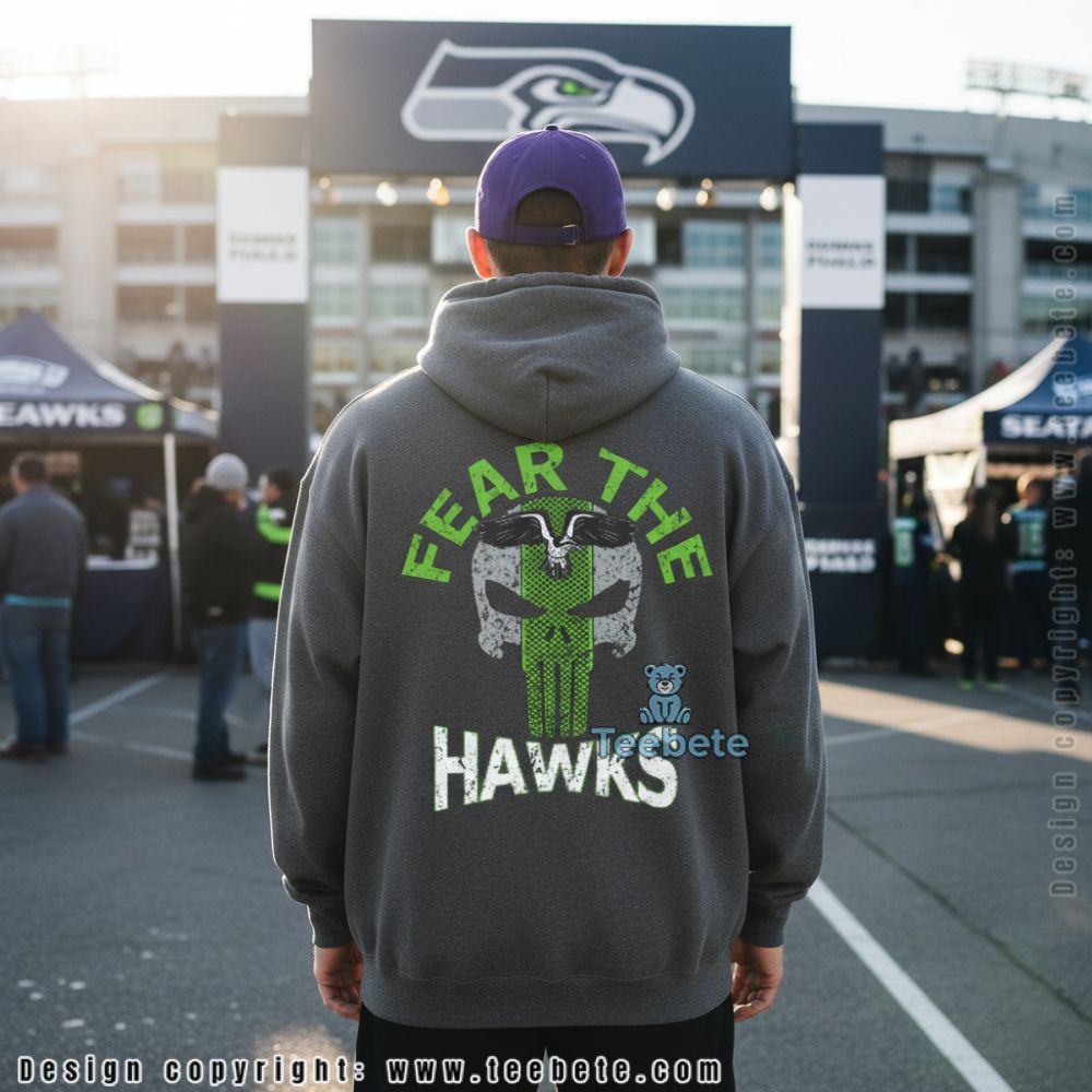 Fans who want their team pride to carry an edge will appreciate this bold design. The back features “FEAR THE HAWKS” text arched around a skull graphic integrated with team colors and logo elements, creating an aggressive aesthetic that reflects Seattle’s intimidating home-field advantage. This design speaks to supporters who embrace the fierce competitive spirit of football culture.