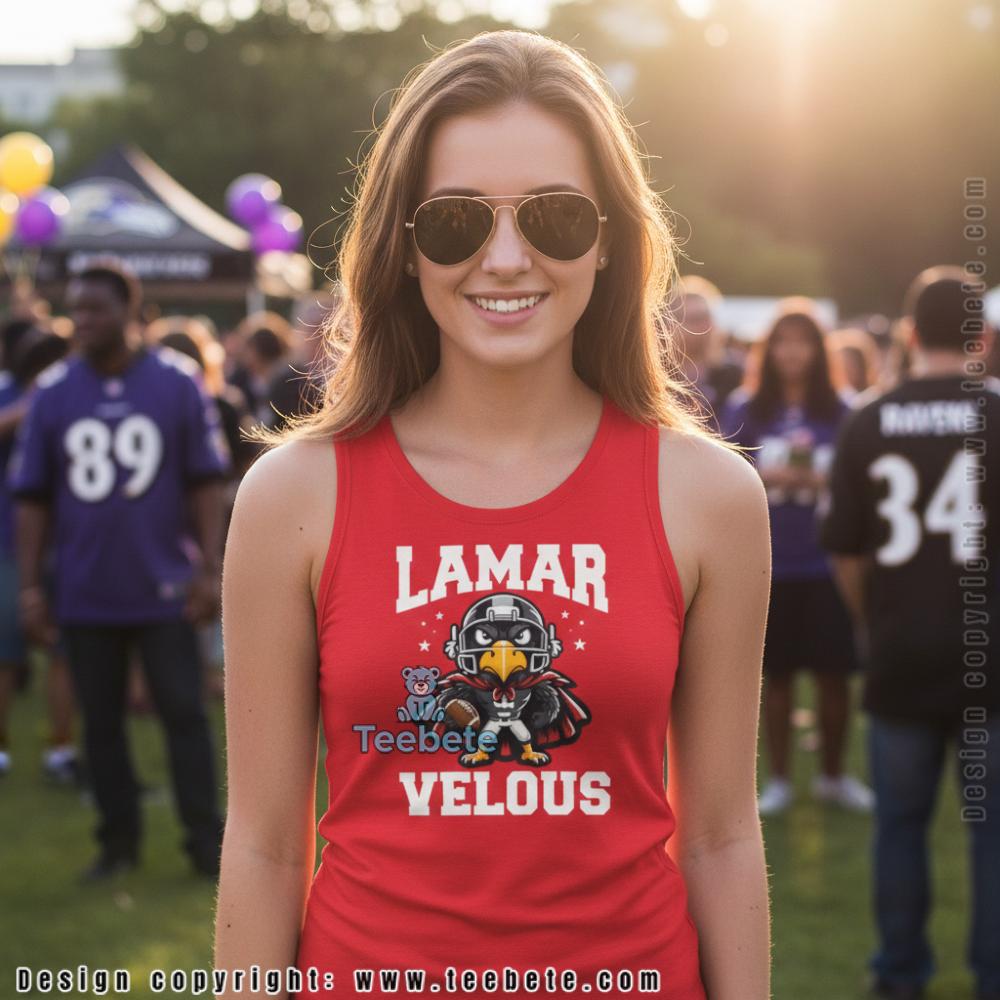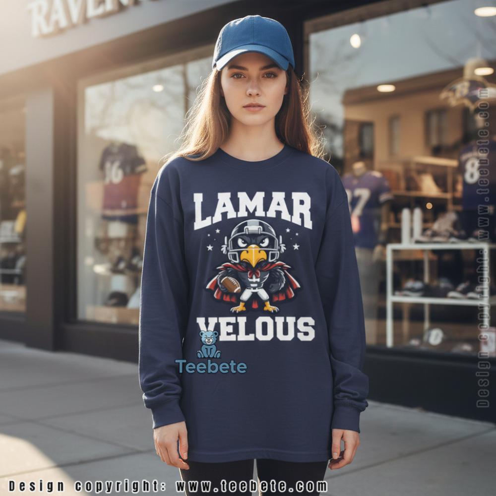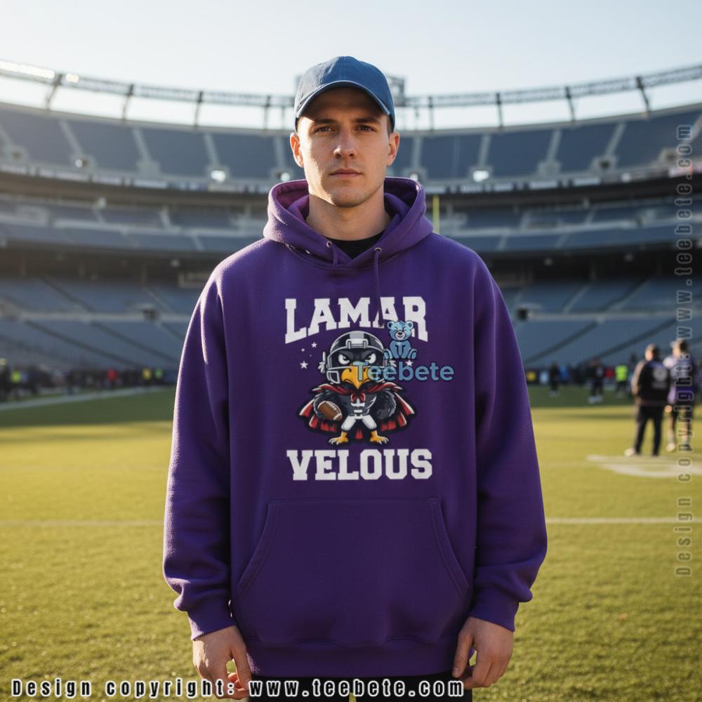 Designed for Baltimore Ravens fans celebrating their star quarterback, this tee features “LAMAR VELOUS” text framing a superhero raven character in Lamar Jackson’s number 8, holding a football with stars surrounding the helmet. Shown in black, this shirt is also available in multiple colors including purple, navy, and sport grey. The playful wordplay transforms the player’s name into a tribute that captures both his elite skill and larger-than-life impact on Ravens football.