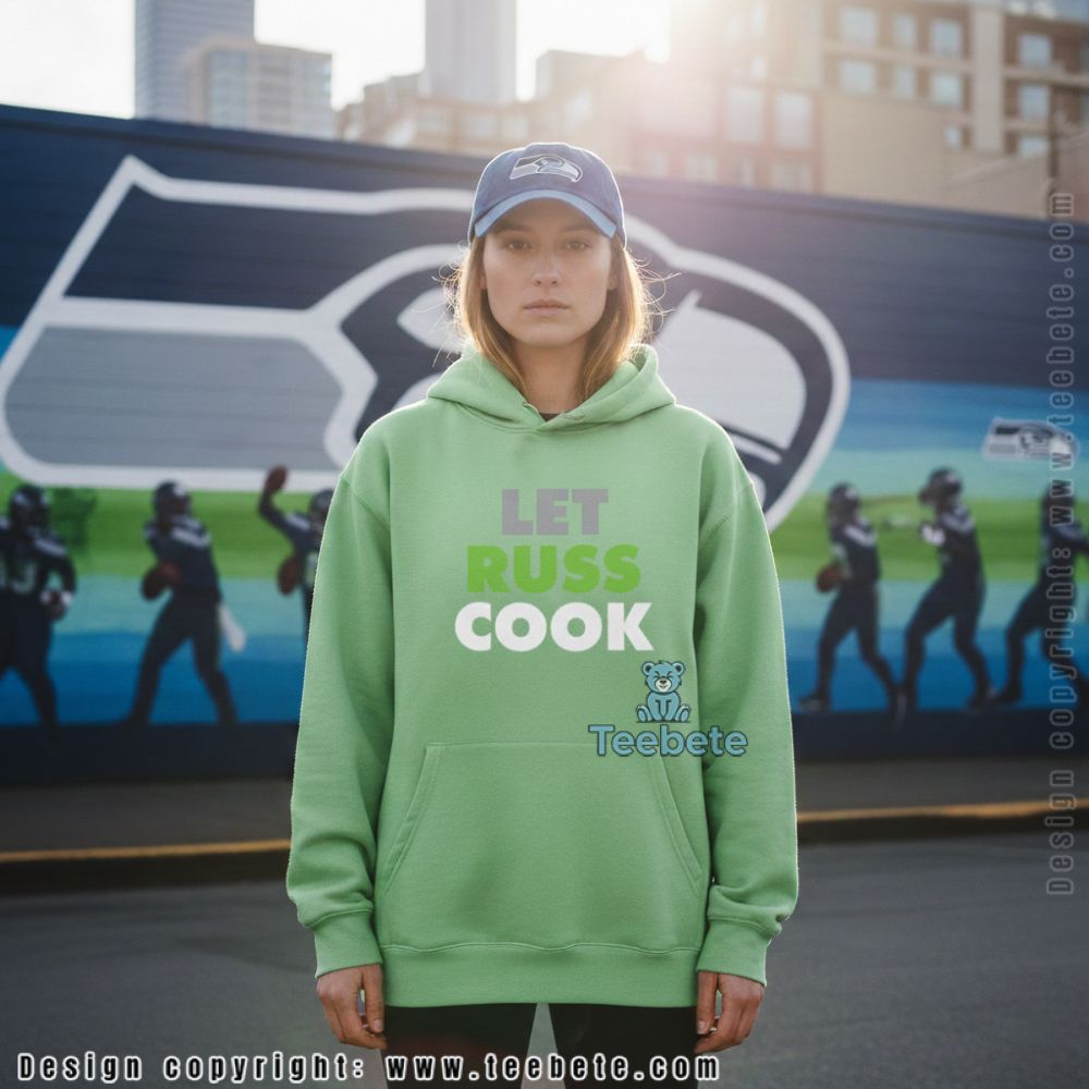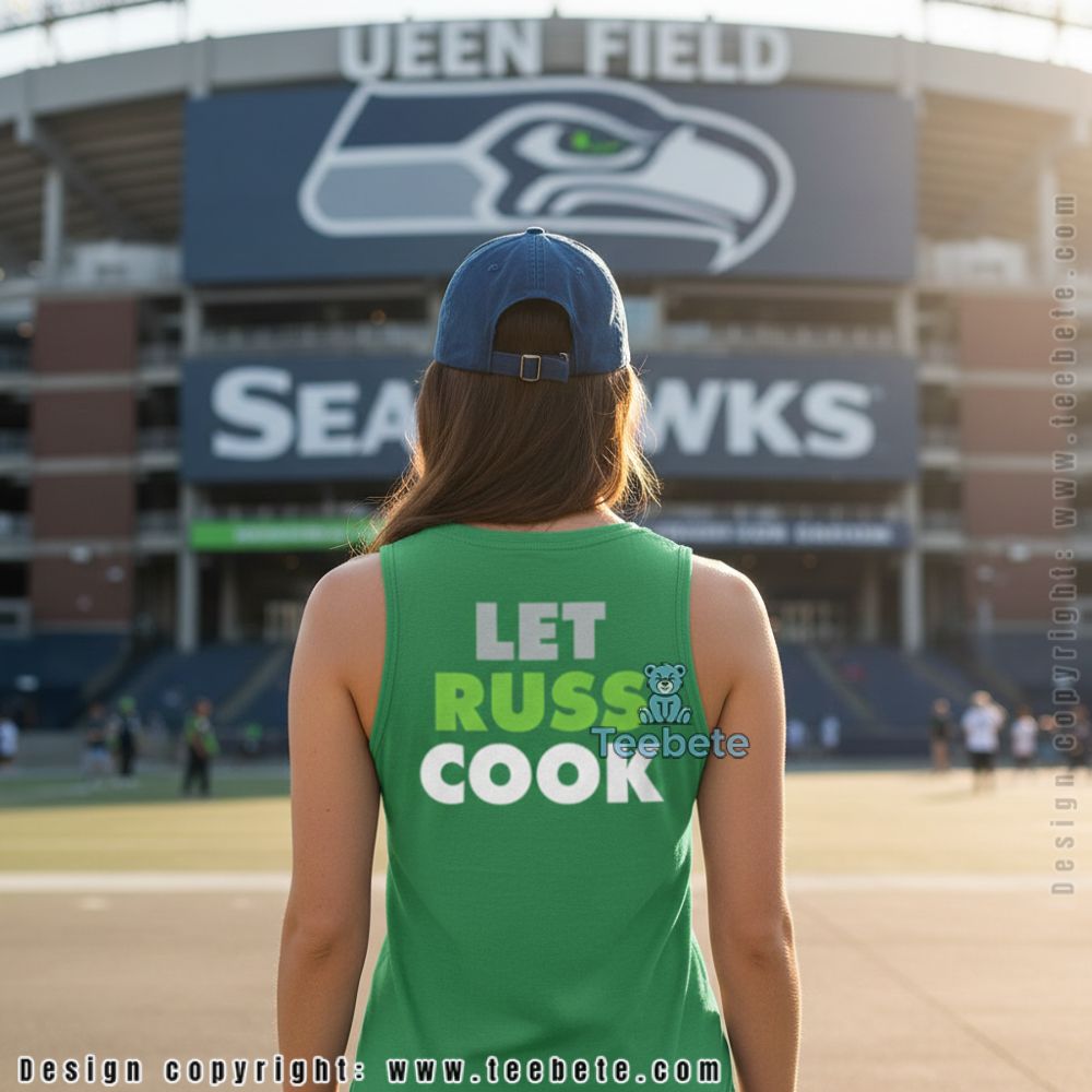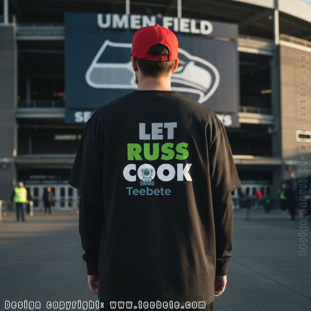 Fans who remember the rallying cry know exactly what this shirt means. The front displays “LET RUSS COOK” in bold white and vibrant green lettering, referencing the movement that celebrated unleashing the quarterback’s full potential. This design captures a specific moment in Seattle football culture that resonates with supporters who followed every debate and discussion.