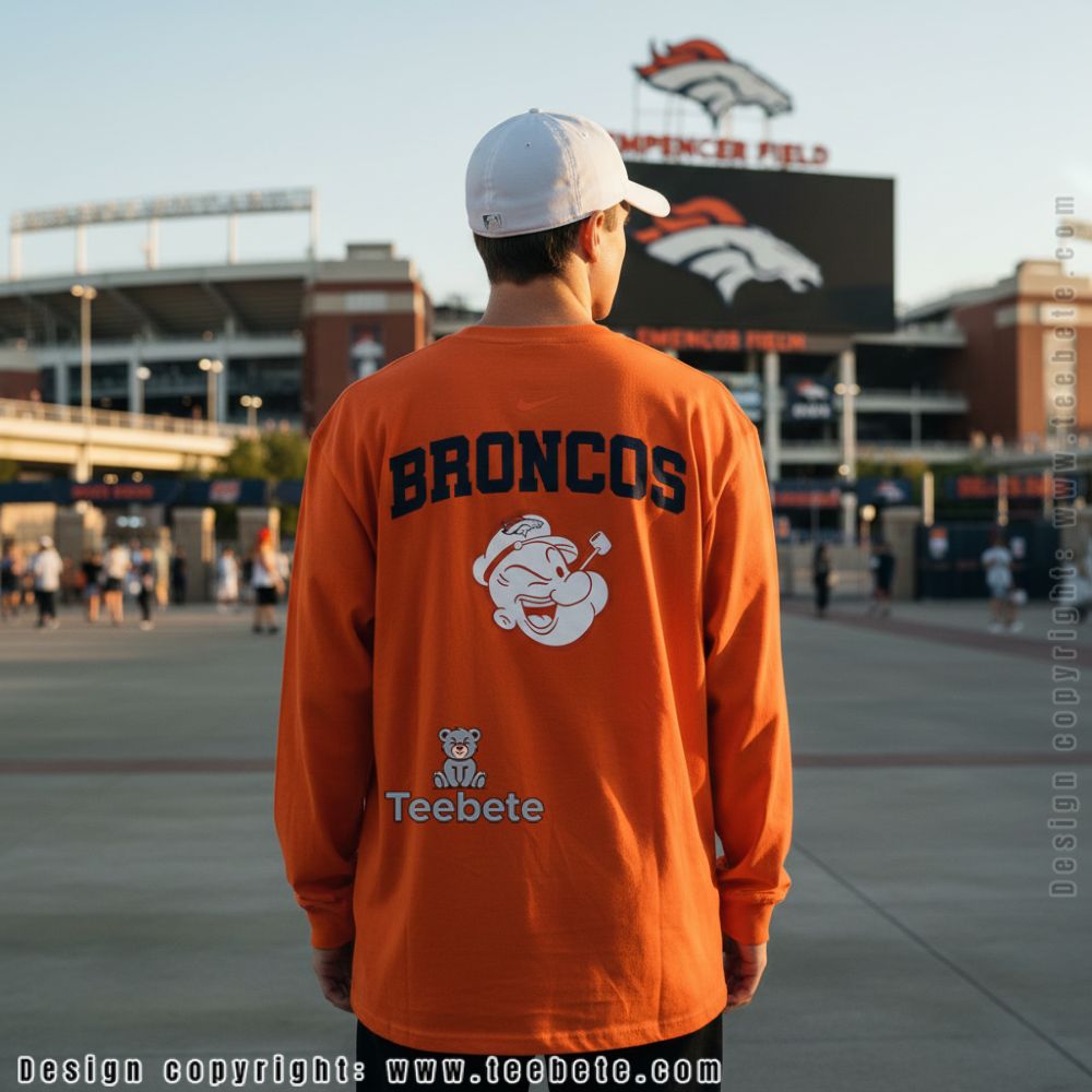 This playful mashup brings together cartoon nostalgia and Denver football pride in one unexpected design. The front features “BRONCOS” in bold outlined lettering above a Popeye-inspired mascot character sporting team colors and a confident grin. It’s for fans who appreciate humor with their game day gear and want something different from standard team apparel.